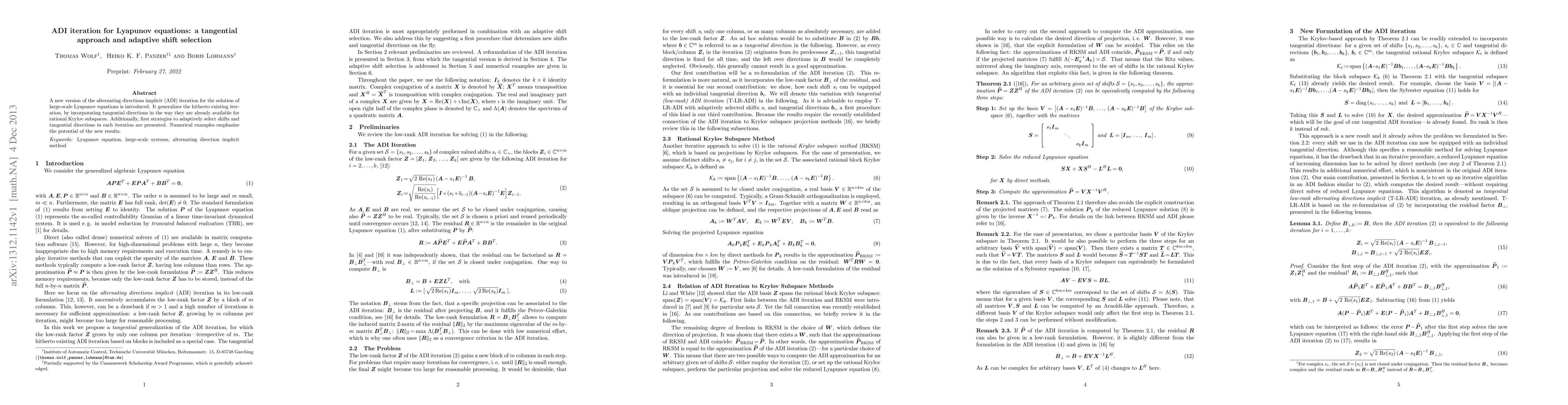 This paper introduces a novel tangential approach to the alternating directions implicit (ADI) iteration for solving large-scale Lyapunov equations, incorporating adaptive shift selection and tangential directions to improve efficiency. Numerical examples demonstrate the effectiveness of the new method.