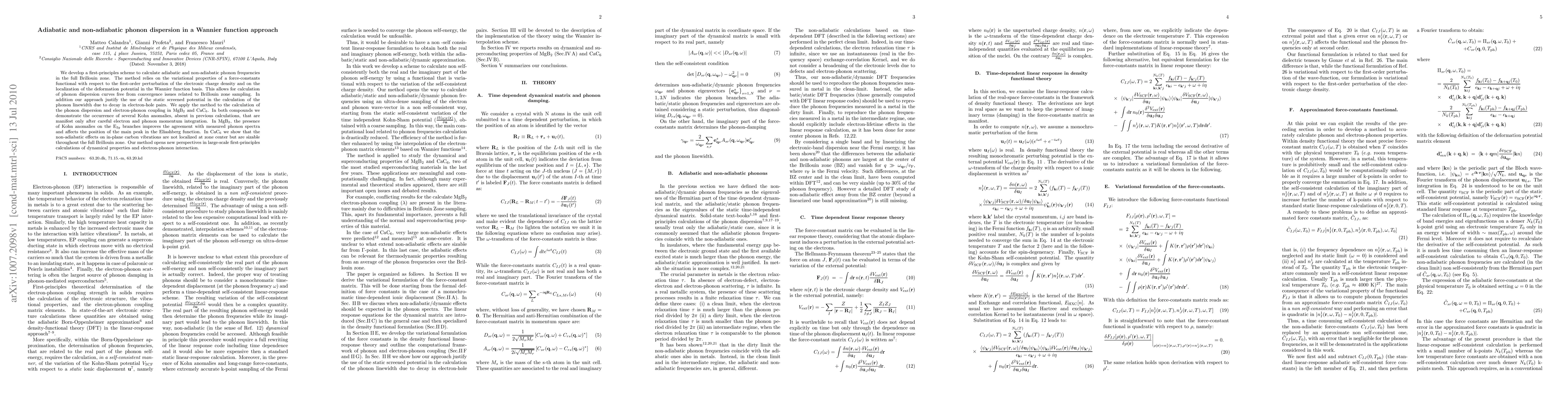 We develop a first-principles scheme to calculate adiabatic and non-adiabatic phonon frequencies in the full Brillouin zone. The method relies on the variational properties of a force-constants functional with respect to the first-order perturbation of the electronic charge density and on the localization of the deformation potential in the Wannier function basis. This allows for calculation of phonon dispersion curves free from convergence issues related to Brillouin zone sampling. In addition our approach justify the use of the static screened potential in the calculation of the phonon linewidth due to decay in electron-hole pairs. We apply the method to the calculation of the phonon dispersion and electron-phonon coupling in MgB$_2$ and CaC$_6$. In both compounds we demonstrate the occurrence of several Kohn anomalies, absent in previous calculations, that are manifest only after careful electron and phonon momentum integration. In MgB$_2$, the presence of Kohn anomalies on the E$_{2g}$ branches improves the agreement with measured phonon spectra and affects the position of the main peak in the Eliashberg function. In CaC$_6$ we show that the non-adiabatic effects on in-plane carbon vibrations are not localized at zone center but are sizable throughout the full Brillouin zone. Our method opens new perspectives in large-scale first-principles calculations of dynamical properties and electron-phonon interaction.