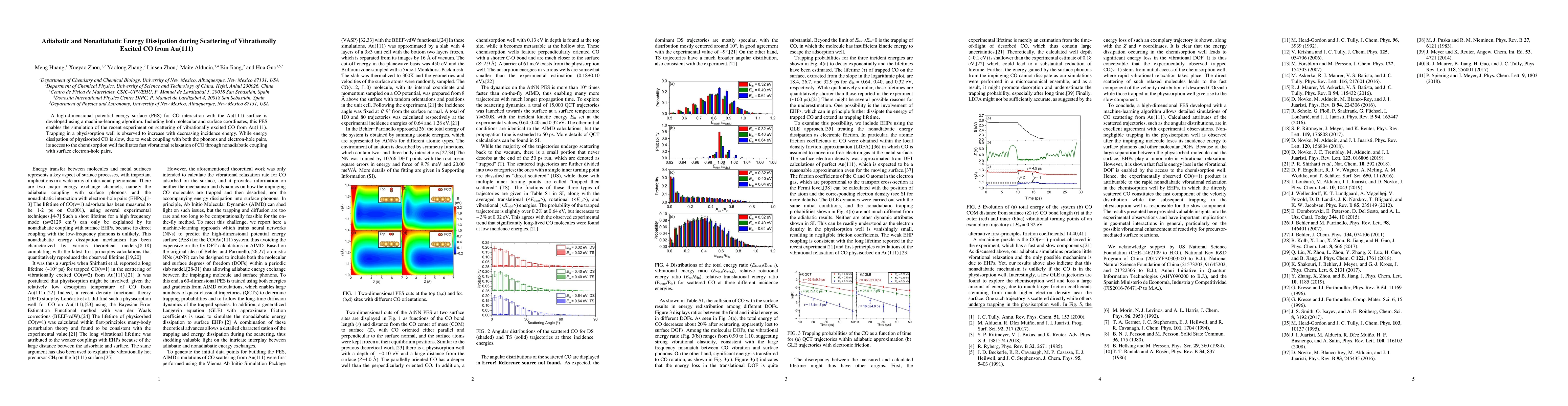 A high-dimensional potential energy surface (PES) for CO interaction with the Au(111) surface is developed using a machine-learning algorithm. Including both molecular and surface coordinates, this PES enables the simulation of the recent experiment on scattering of vibrationally excited CO from Au(111). Trapping in a physisorption well is observed to increase with decreasing incidence energy. While energy dissipation of physisorbed CO is slow, due to weak coupling with both the phonons and electron-hole pairs, its access to the chemisorption well facilitates fast vibrational relaxation of CO through nonadiabatic coupling with surface electron-hole pairs.