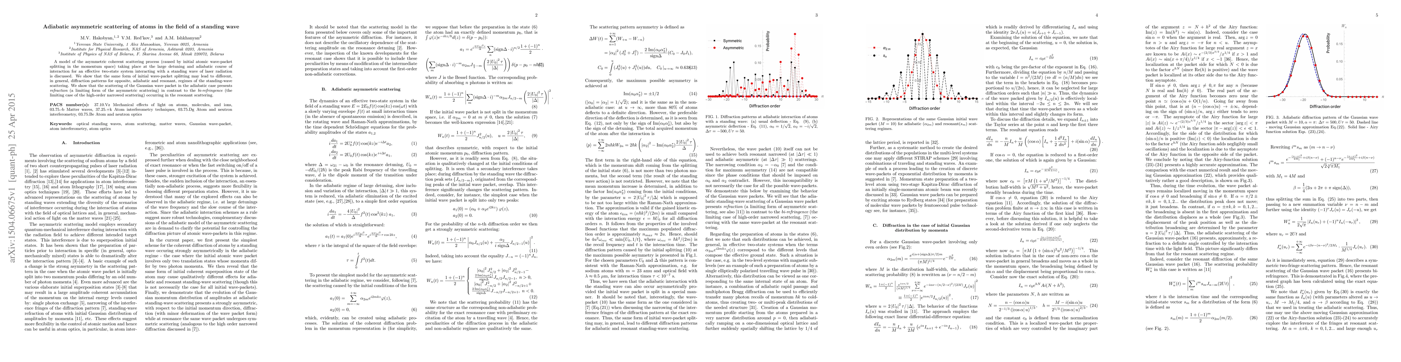 A model of the asymmetric coherent scattering process (caused by initial atomic wave-packet splitting in the momentum space) taking place at the large detuning and adiabatic course of interaction for an effective two-state system interacting with a standing wave of laser radiation is discussed. We show that the same form of initial wave-packet splitting may lead to different, in general, diffraction patterns for opposite, adiabatic and resonant, regimes of the standing-wave scattering. We show that the scattering of the Gaussian wave packet in the adiabatic case presents refraction (a limiting form of the asymmetric scattering) in contrast to the bi-refringence (the limiting case of the high-order narrowed scattering) occurring in the resonant scattering.