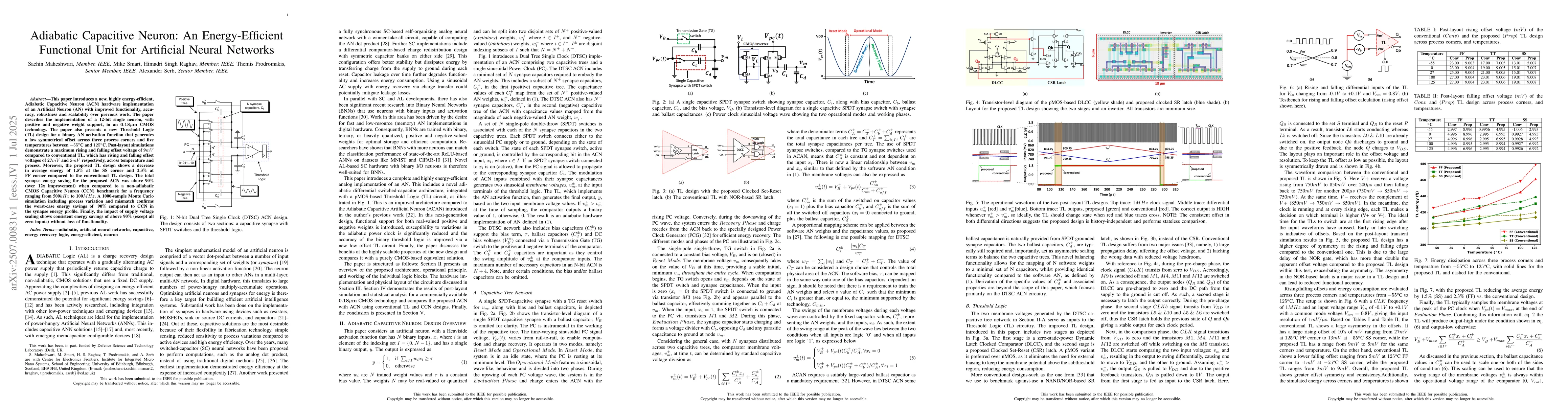 The paper presents an energy-efficient Adiabatic Capacitive Neuron (ACN) hardware design for Artificial Neural Networks, demonstrating 90%+ synapse energy savings compared to conventional methods. It introduces a novel Threshold Logic design for binary activation functions, maintaining accuracy across temperature and process variations.