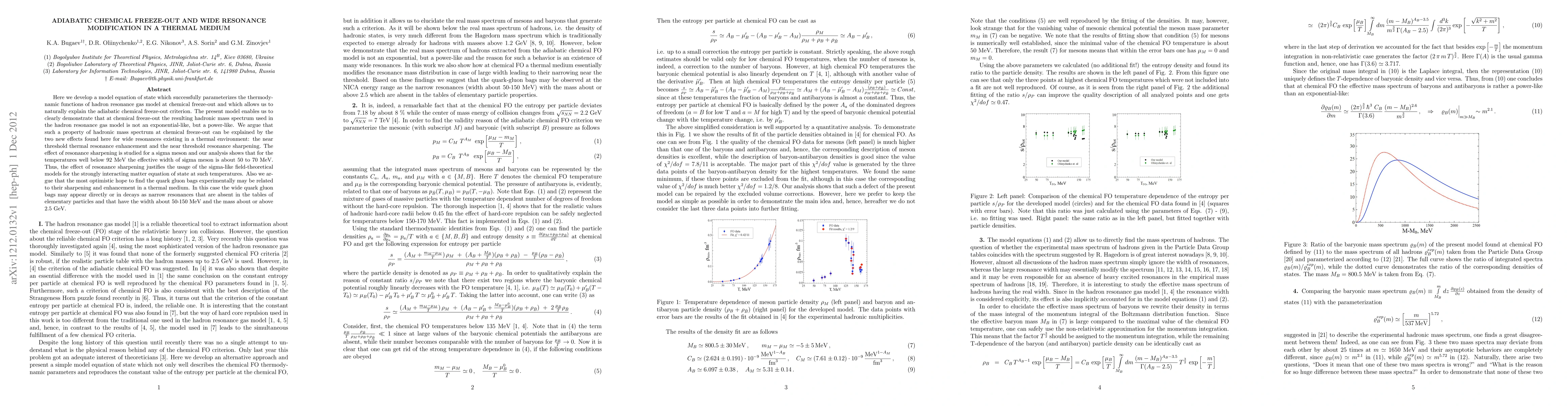Here we develop a model equation of state which successfully parameterizes the thermodynamic functions of hadron resonance gas model at chemical freeze-out and which allows us to naturally explain the adiabatic chemical freeze-out criterion. The present model enables us to clearly demonstrate that at chemical freeze-out the resulting hadronic mass spectrum used in the hadron resonance gas model is not an exponential-like, but a power-like. We argue that such a property of hadronic mass spectrum at chemical freeze-out can be explained by the two new effects found here for wide resonances existing in a thermal environment: the near threshold thermal resonance enhancement and the near threshold resonance sharpening. The effect of resonance sharpening is studied for a sigma meson and our analysis shows that for the temperatures well below 92 MeV the effective width of sigma meson is about 50 to 70 MeV. Thus, the effect of resonance sharpening justifies the usage of the sigma-like field-theoretical models for the strongly interacting matter equation of state at such temperatures. Also we argue that the most optimistic hope to find the quark gluon bags experimentally may be related to their sharpening and enhancement in a thermal medium. In this case the wide quark gluon bags may appear directly or in decays as narrow resonances that are absent in the tables of elementary particles and that have the width about 50-150 MeV and the mass about or above 2.5 GeV.