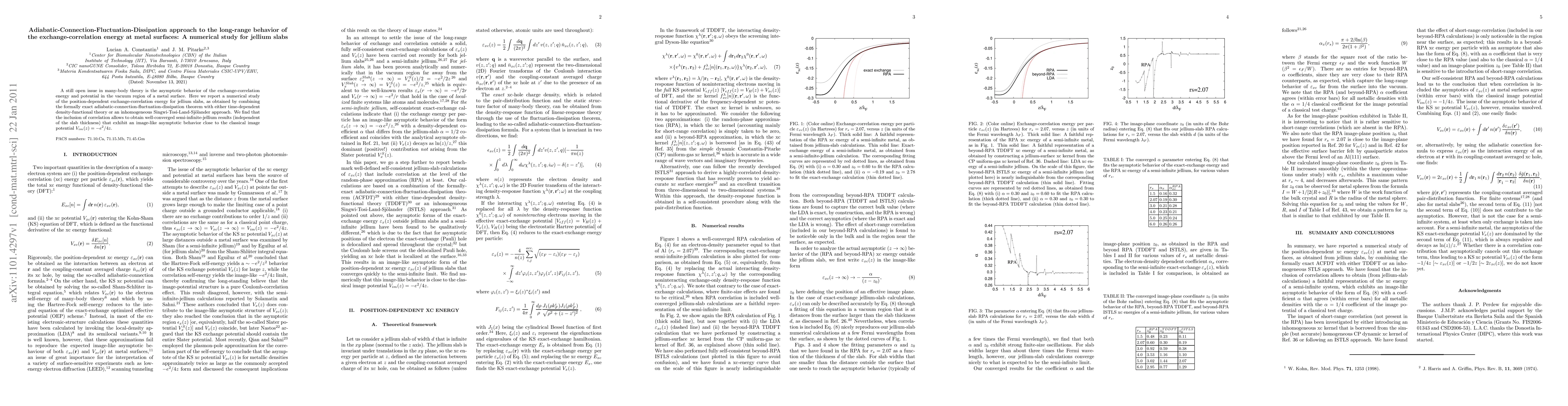 A still open issue in many-body theory is the asymptotic behavior of the exchange-correlation energy and potential in the vacuum region of a metal surface. Here we report a numerical study of the position-dependent exchange-correlation energy for jellium slabs, as obtained by combining the formally exact adiabatic-connection-fluctuation-dissipation theorem with either time-dependent density-functional theory or an inhomogeneous Singwi-Tosi-Land-Sj\"olander approach. We find that the inclusion of correlation allows to obtain well-converged semi-infinite-jellium results (independent of the slab thickness) that exhibit an image-like asymptotic behavior close to the classical image potential $V_{im}(z)=-e^2/4z$.