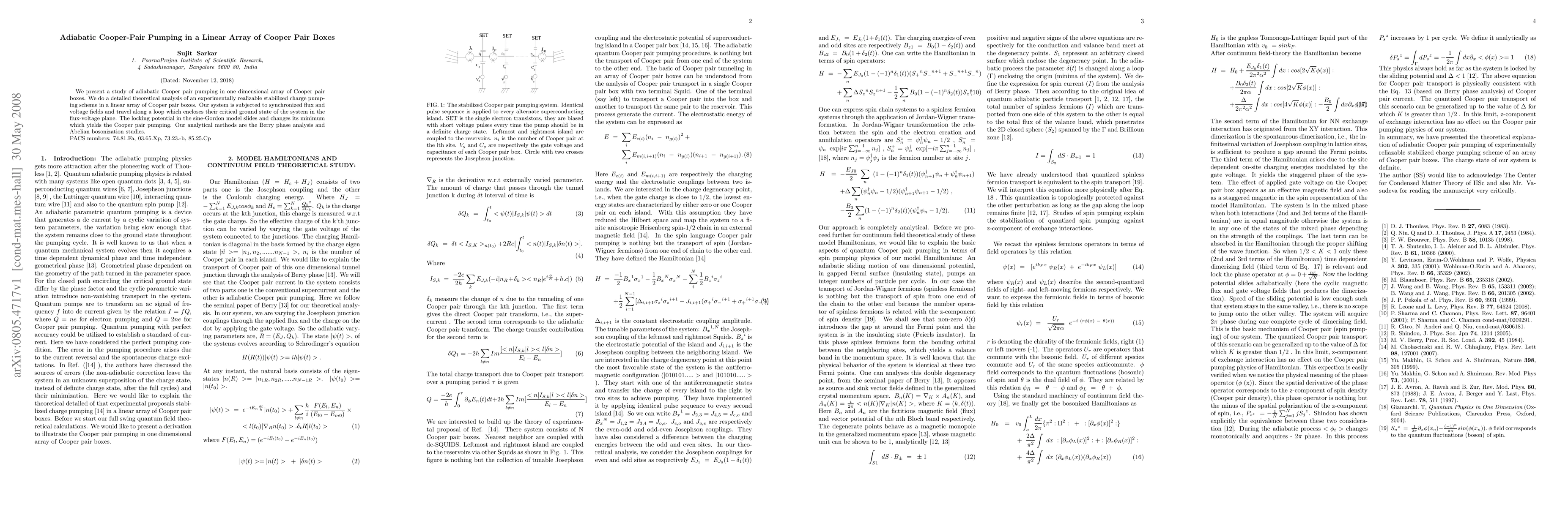 This paper investigates adiabatic Cooper pair pumping in a linear array of Cooper pair boxes using synchronized flux and voltage fields. The study employs analytical methods, including Berry phase analysis and Abelian bosonization, to analyze a stabilized charge pumping scheme.