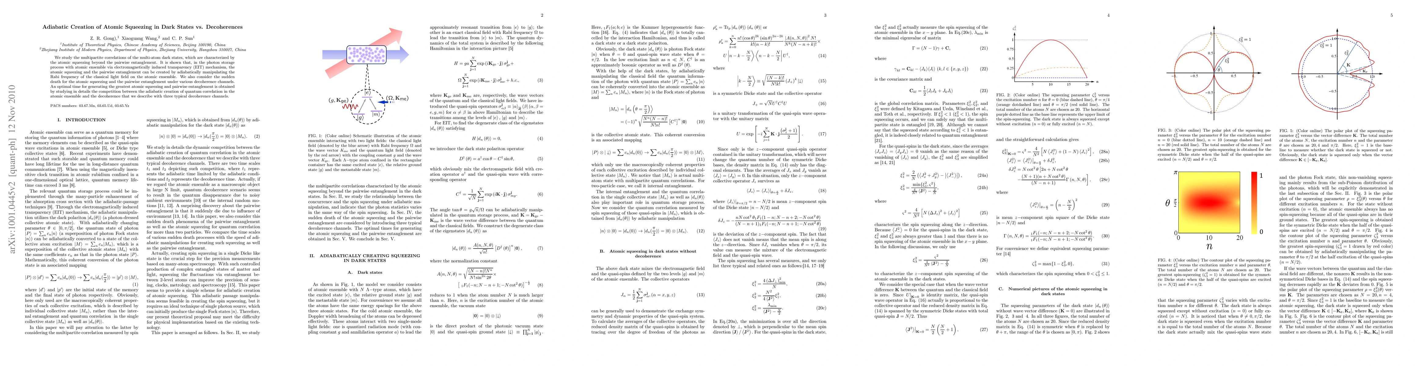 We study the multipartite correlations of the multi-atom dark states, which are characterized by the atomic squeezing beyond the pairwise entanglement. It is shown that, in the photon storage process with atomic ensemble via electromagnetically induced transparency (EIT) mechanism, the atomic squeezing and the pairwise entanglement can be created by adiabatically manipulating the Rabi frequency of the classical light field on the atomic ensemble. We also consider the sudden death for the atomic squeezing and the pairwise entanglement under various decoherence channels. An optimal time for generating the greatest atomic squeezing and pairwise entanglement is obtained by studying in details the competition between the adiabatic creation of quantum correlation in the atomic ensemble and the decoherence that we describe with three typical decoherence channels.