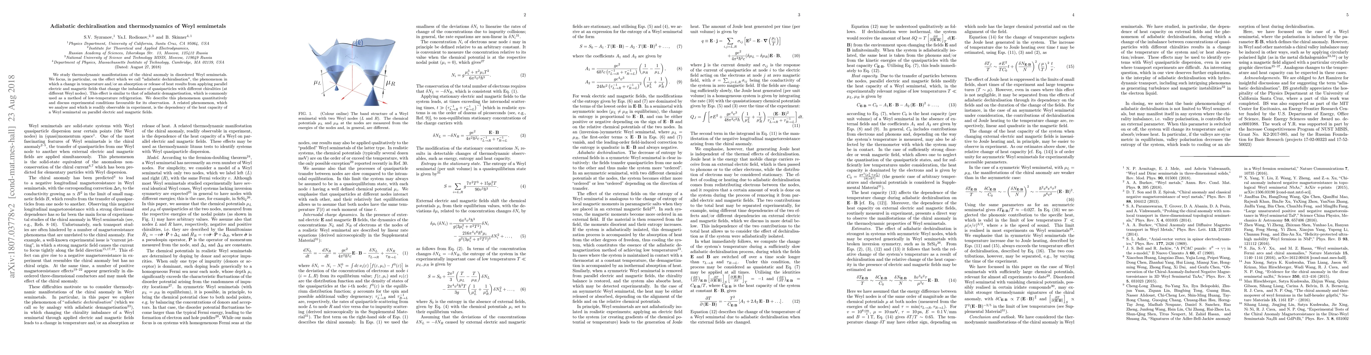 This paper investigates the thermodynamic effects of the chiral anomaly in disordered Weyl semimetals, focusing on "adiabatic dechiralization," a process where temperature changes due to electric and magnetic fields altering quasiparticle chirality imbalance. It quantitatively describes this phenomenon and discusses experimental conditions for its observation, alongside analyzing the heat capacity dependency on these fields.