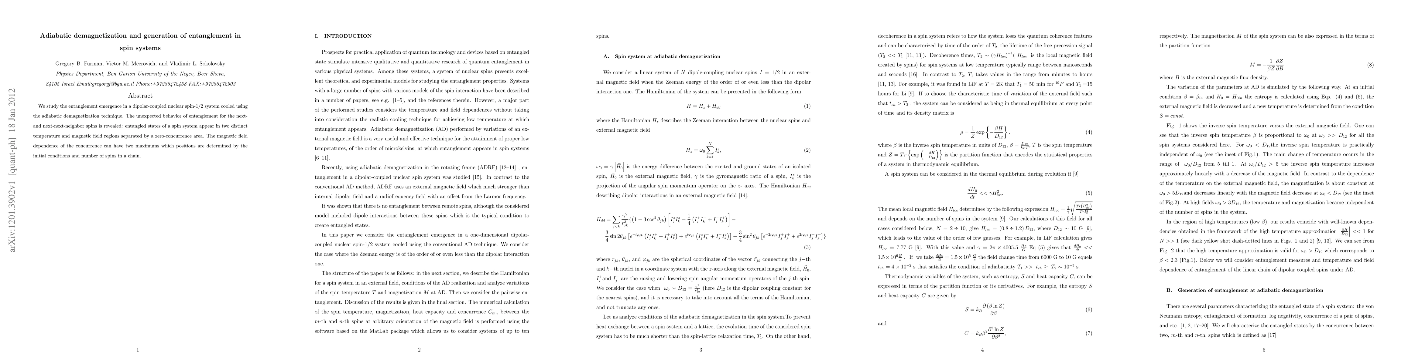 This paper investigates the emergence of entanglement in a dipolar-coupled nuclear spin-1/2 system via adiabatic demagnetization, revealing that entangled states appear in two distinct temperature and magnetic field regions, with concurrence showing two maximums dependent on initial conditions and spin chain length.