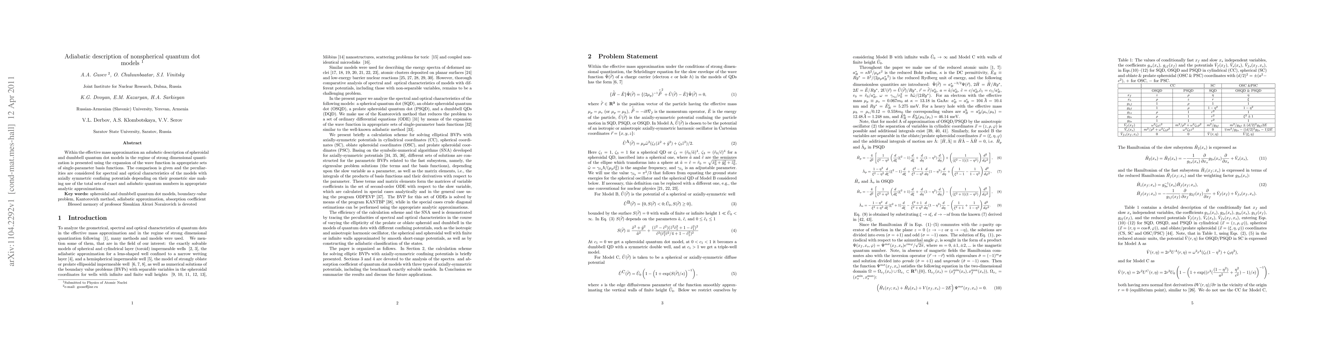 This research paper presents an adiabatic description for spheroidal and dumbbell-shaped quantum dot models using the effective mass approximation. It compares spectral and optical characteristics of axially symmetric confining potentials based on their geometric size, utilizing total sets of exact and adiabatic quantum numbers in analytic approximations.
