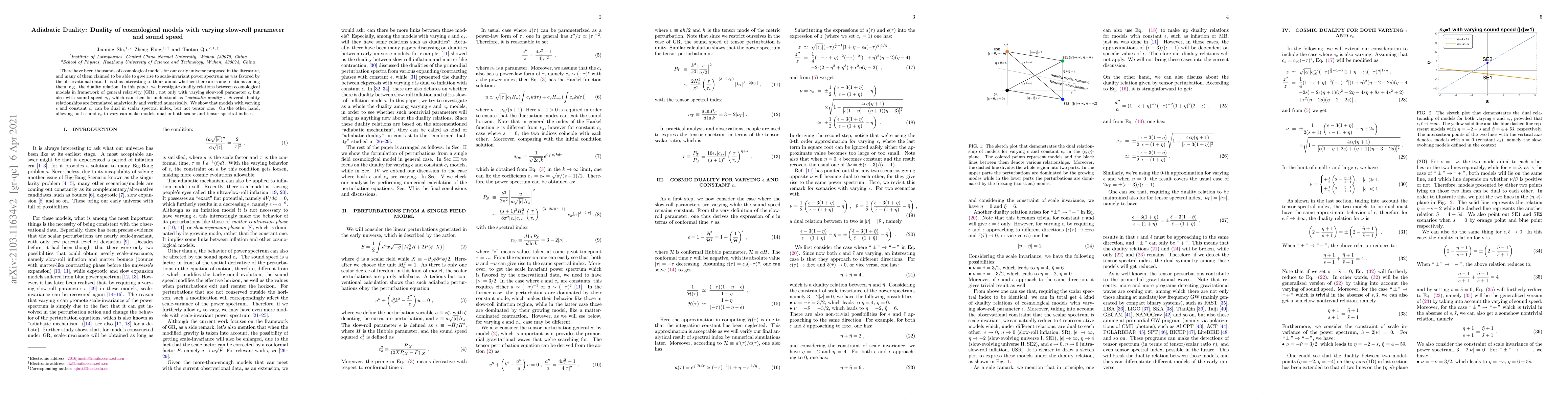 This paper explores "adiabatic duality" in cosmological models within general relativity, focusing on relationships between models with varying slow-roll parameter $\epsilon$ and sound speed $c_s$. Analytical and numerical results reveal that models with varying $\epsilon$ and constant $c_s$ can be dual in scalar spectral index but not tensor, while allowing both $\epsilon$ and $c_s$ to vary can make models dual in both scalar and tensor spectral indices.