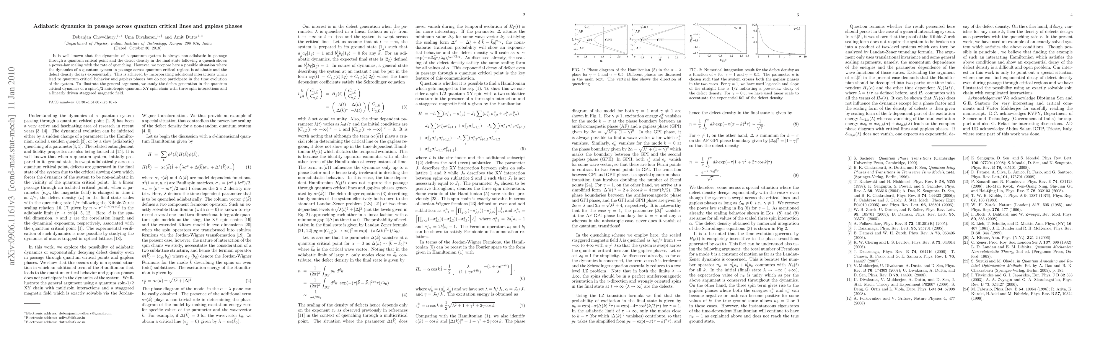 This paper proposes that under certain additional interactions, a quantum system can exhibit adiabatic dynamics across quantum critical regions, resulting in an exponential decay of defect density during passage, contrary to the typical non-adiabatic behavior. It demonstrates this concept using a spin-1/2 anisotropic quantum XY spin chain model.