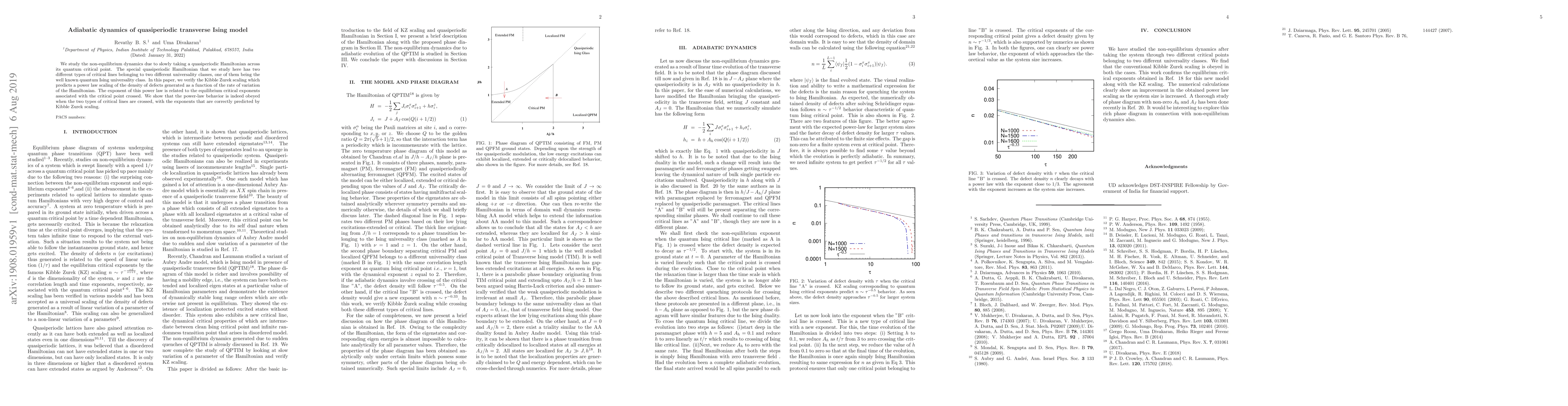 We study the non-equilibrium dynamics due to slowly taking a quasiperiodic Hamiltonian across its quantum critical point. The special quasiperiodic Hamiltonian that we study here has two different types of critical lines belonging to two different universality classes, one of them being the well known quantum Ising universality class. In this paper, we verify the Kibble Zurek scaling which predicts a power law scaling of the density of defects generated as a function of the rate of variation of the Hamiltonian. The exponent of this power law is related to the equilibrium critical exponents associated with the critical point crossed. We show that the power-law behavior is indeed obeyed when the two types of critical lines are crossed, with the exponents that are correctly predicted by Kibble Zurek scaling.