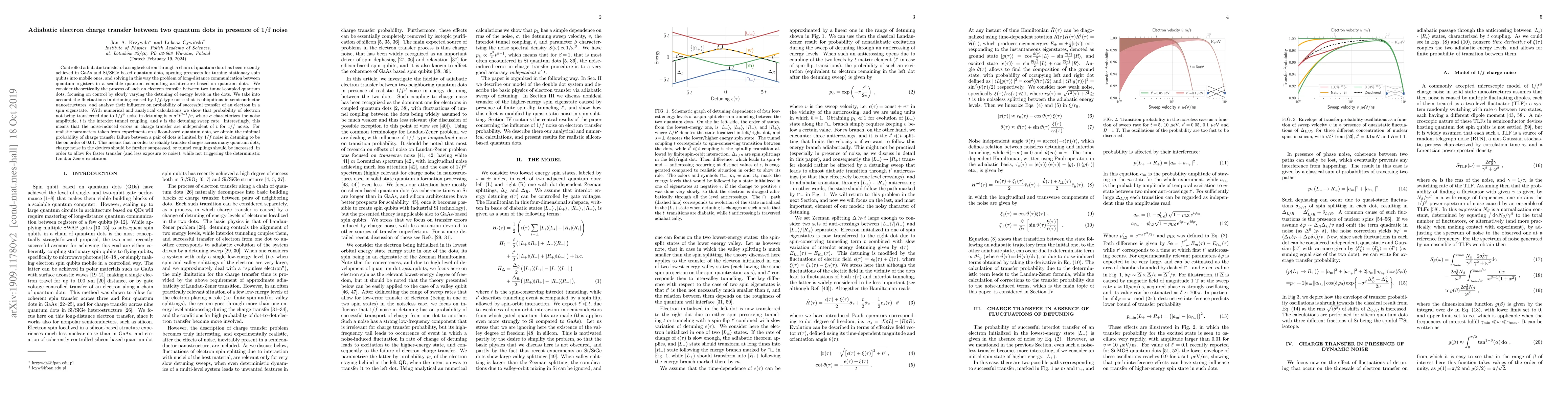 This paper investigates adiabatic electron charge transfer between two quantum dots under the influence of $1/f$ noise, demonstrating that noise-induced errors are independent of interdot tunnel coupling for $1/f$ noise. The study finds that the probability of charge transfer failure is proportional to noise amplitude and sweep rate, suggesting that further noise suppression or increased tunnel couplings are necessary for reliable charge transfer in quantum computing architectures.