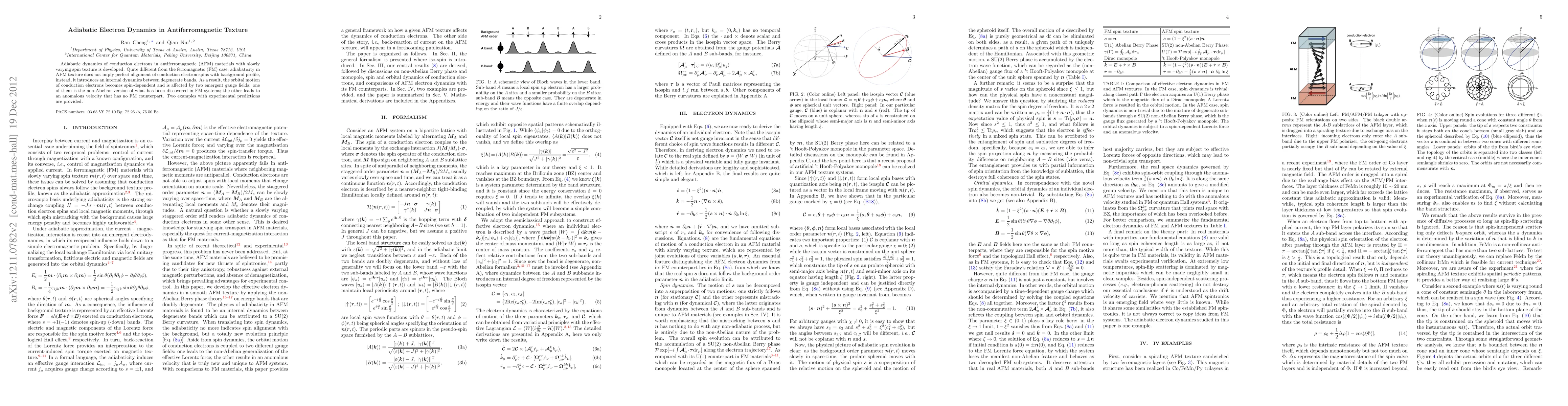 Adiabatic dynamics of conduction electrons in antiferromagnetic (AFM) materials with slowly varying spin texture is developed. Quite different from the ferromagnetic (FM) case, adiabaticity in AFM texture does not imply perfect alignment of conduction electron spins with background profile, instead, it introduces an internal dynamics between degenerate bands. As a result, the orbital motion of conduction electrons becomes spin-dependent and is affected by two emergent gauge fields: one of them is the non-Abelian version of what has been discovered in FM systems; the other leads to an anomalous velocity that has no FM counterpart. Two examples with experimental predictions are provided.