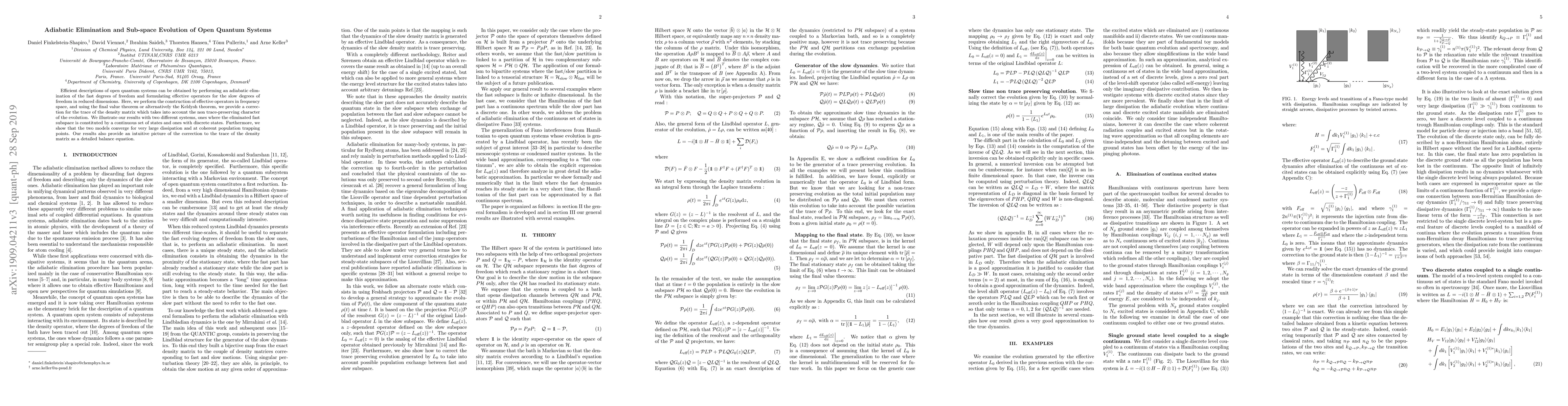 This paper proposes an adiabatic elimination method to describe open quantum systems by focusing on slow degrees of freedom, constructing effective operators in frequency space, and correcting the trace of the density matrix to account for non-trace-preserving evolution. It demonstrates convergence of the method under large dissipation and at coherent population trapping points.