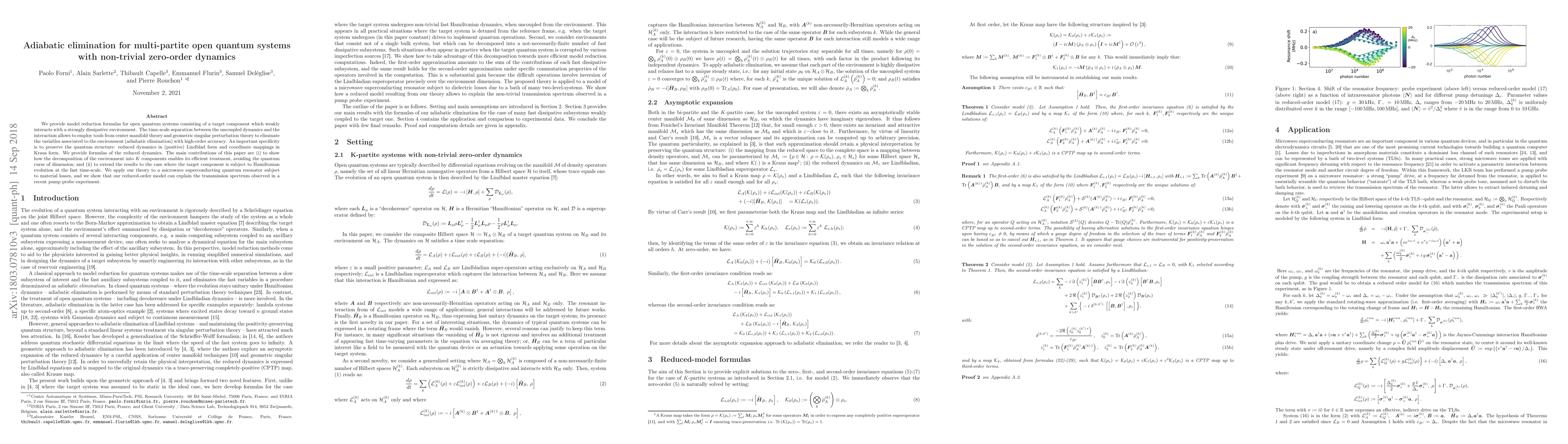 We provide model reduction formulas for open quantum systems consisting of a target component which weakly interacts with a strongly dissipative environment. The time-scale separation between the uncoupled dynamics and the interaction allows to employ tools from center manifold theory and geometric singular perturbation theory to eliminate the variables associated to the environment (adiabatic elimination) with high-order accuracy. An important specificity is to preserve the quantum structure: reduced dynamics in (positive) Lindblad form and coordinate mappings in Kraus form. We provide formulas of the reduced dynamics. The main contributions of this paper are (i) to show how the decomposition of the environment into $K$ components enables its efficient treatment, avoiding the quantum curse of dimension; and (ii) to extend the results to the case where the target component is subject to Hamiltonian evolution at the fast time-scale. We apply our theory to a microwave superconducting quantum resonator subject to material losses, and we show that our reduced-order model can explain the transmission spectrum observed in a recent pump probe experiment.
