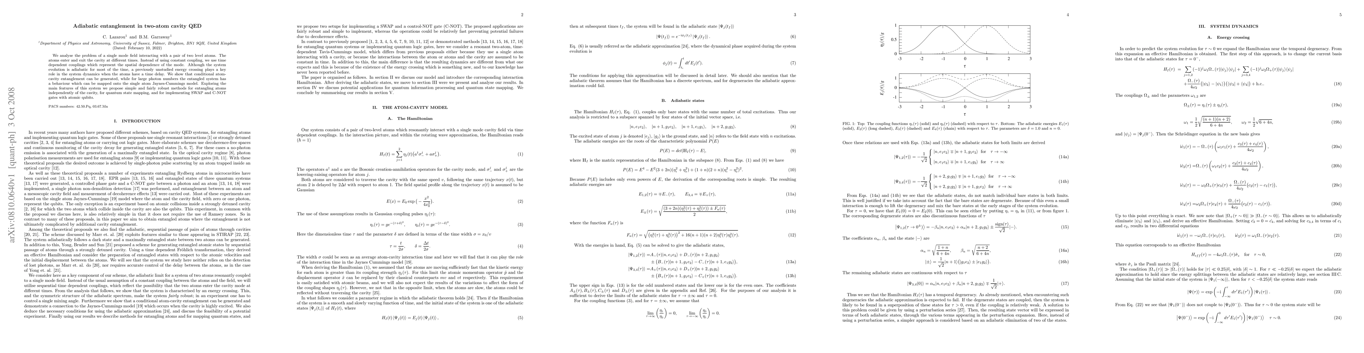 We analyse the problem of a single mode field interacting with a pair of two level atoms. The atoms enter and exit the cavity at different times. Instead of using constant coupling, we use time dependent couplings which represent the spatial dependence of the mode. Although the system evolution is adiabatic for most of the time, a previously unstudied energy crossing plays a key role in the system dynamics when the atoms have a time delay. We show that conditional atom-cavity entanglement can be generated, while for large photon numbers the entangled system has a behaviour which can be mapped onto the single atom Jaynes-Cummings model. Exploring the main features of this system we propose simple and fairly robust methods for entangling atoms independently of the cavity, for quantum state mapping, and for implementing SWAP and C-NOT gates with atomic qubits.