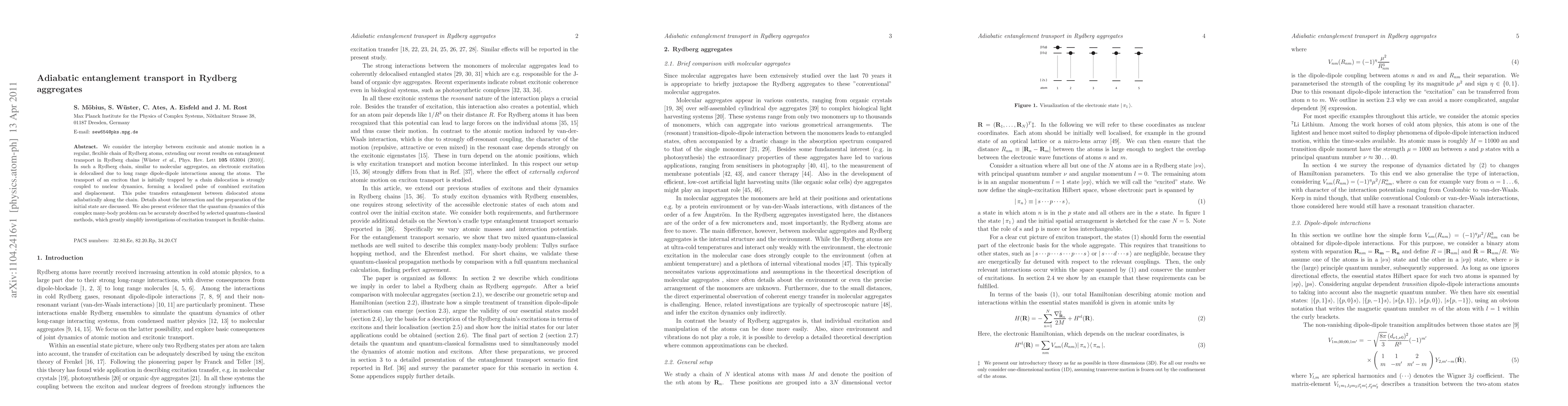 We consider the interplay between excitonic and atomic motion in a regular, flexible chain of Rydberg atoms, extending our recent results on entanglement transport in Rydberg chains [W\"uster et al., Phys.Rev.Lett 105 053004 (2010)]. In such a Rydberg chain, similar to molecular aggregates, an electronic excitation is delocalised due to long range dipole-dipole interactions among the atoms. The transport of an exciton that is initially trapped by a chain dislocation is strongly coupled to nuclear dynamics, forming a localised pulse of combined excitation and displacement. This pulse transfers entanglement between dislocated atoms adiabatically along the chain. Details about the interaction and the preparation of the initial state are discussed. We also present evidence that the quantum dynamics of this complex many-body problem can be accurately described by selected quantum-classical methods, which greatly simplify investigations of excitation transport in flexible chains.