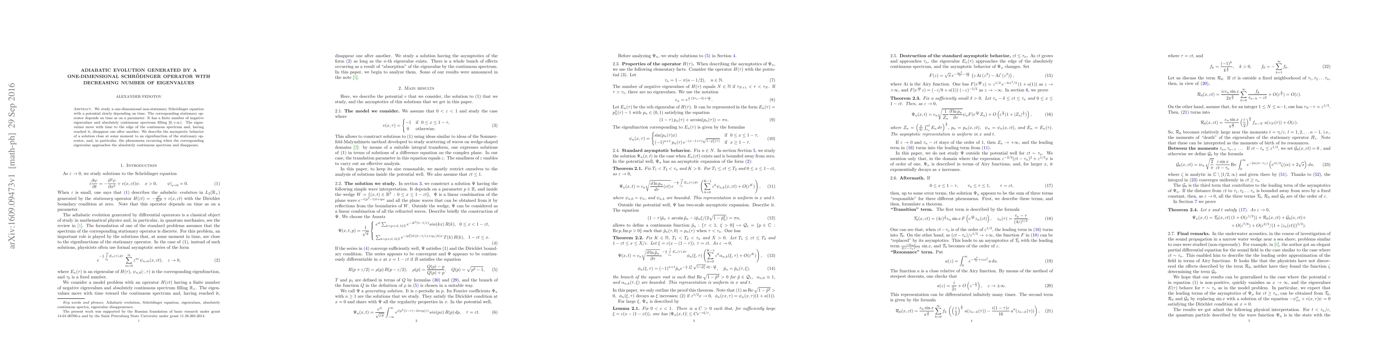 This paper investigates the adiabatic evolution of a one-dimensional non-stationary Schrödinger equation with a time-dependent potential. It focuses on the behavior of eigenvalues as they move towards and disappear at the edge of the continuous spectrum, analyzing the phenomena occurring when an eigenvalue vanishes.