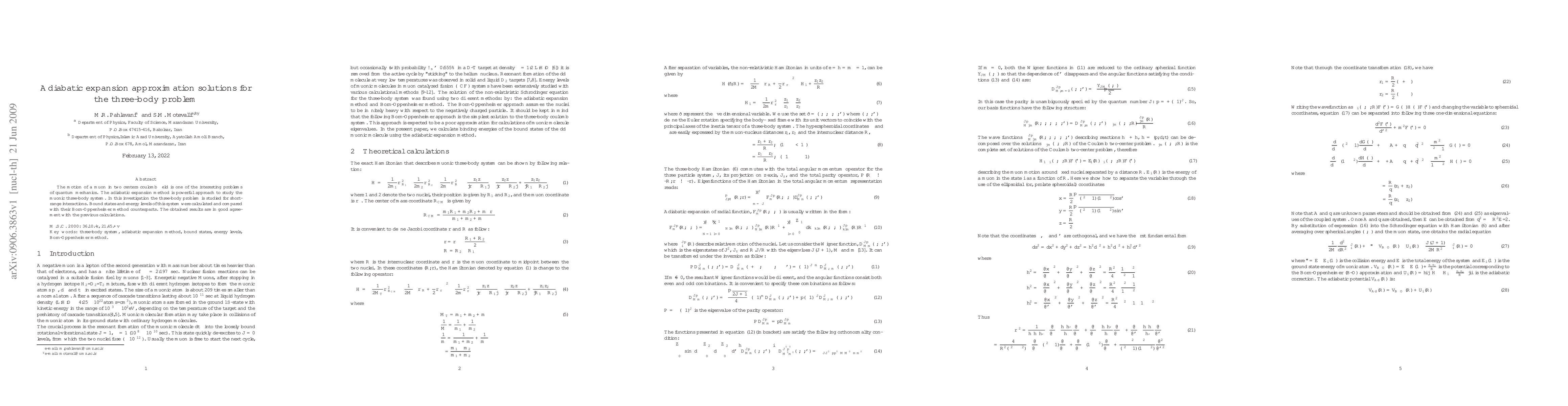 The motion of a muon in two centers coulomb field is one of the interesting problems of quantum mechanics. The adiabatic expansion method is powerful approach to study the muonic three-body system. In this investigation the three-body problem is studied for short-range interactions. Bound states and energy levels of this system were calculated and compared with their Born-Oppenheimer method counterparts. The obtained results are in good agreement with the previous calculations.