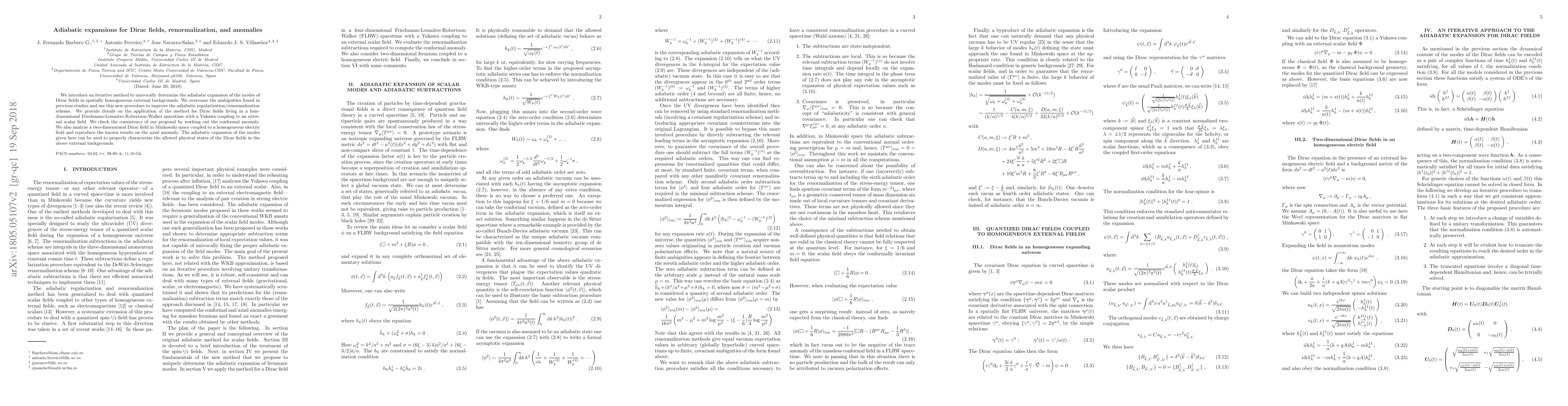 We introduce an iterative method to univocally determine the adiabatic expansion of the modes of Dirac fields in spatially homogeneous external backgrounds. We overcome the ambiguities found in previous studies and use this new procedure to improve the adiabatic regularization/renormalization scheme. We provide details on the application of the method for Dirac fields living in a four-dimensional Friedmann-Lemaitre-Robertson-Walker spacetime with a Yukawa coupling to an external scalar field. We check the consistency of our proposal by working out the conformal anomaly. We also analyze a two-dimensional Dirac field in Minkowski space coupled to a homogeneous electric field and reproduce the known results on the axial anomaly. The adiabatic expansion of the modes given here can be used to properly characterize the allowed physical states of the Dirac fields in the above external backgrounds.