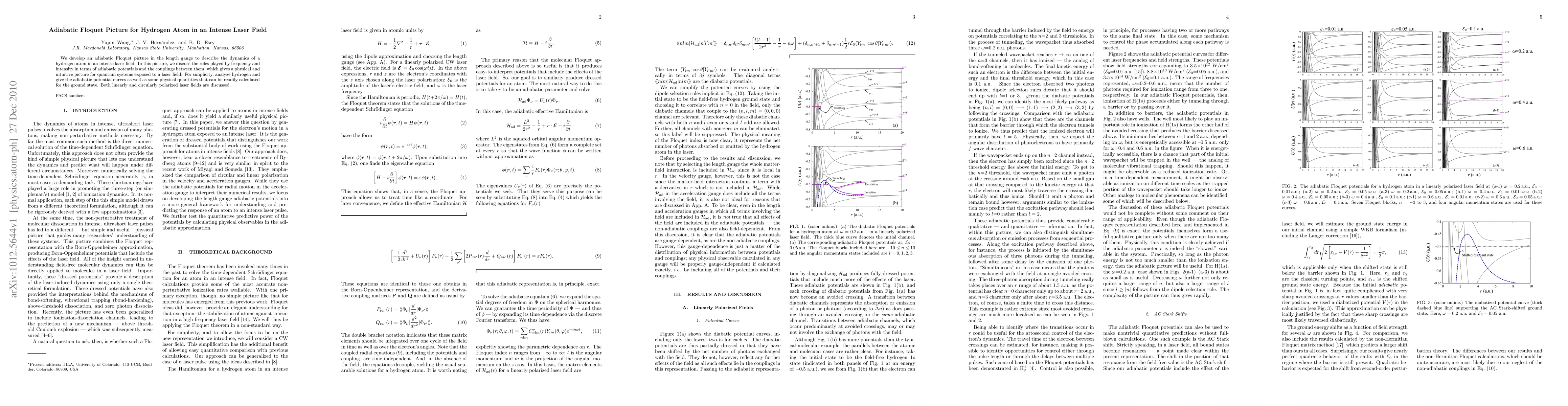 This paper develops an adiabatic Floquet picture to describe the dynamics of a hydrogen atom in intense laser fields, focusing on the roles of frequency and intensity through adiabatic potentials and their couplings. It provides a physical interpretation for quantum systems under laser exposure and calculates relevant physical quantities for the hydrogen ground state under both linear and circular polarization.