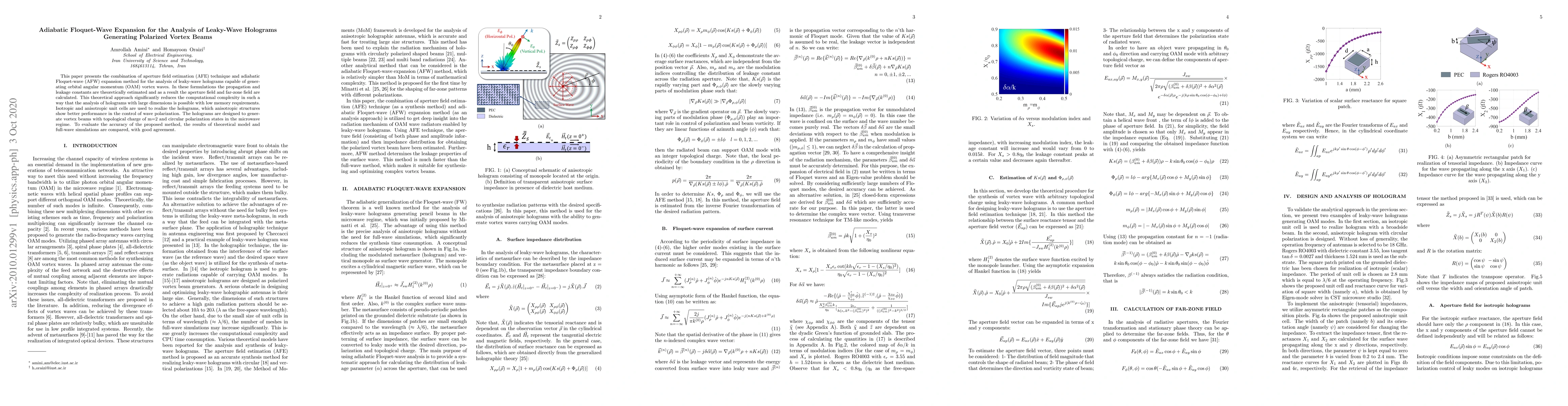 This paper combines aperture field estimation and adiabatic Floquet-wave expansion to analyze leaky-wave holograms generating OAM vortex beams, significantly reducing computational complexity. The method is validated by comparing theoretical and full-wave simulation results, showing good agreement.