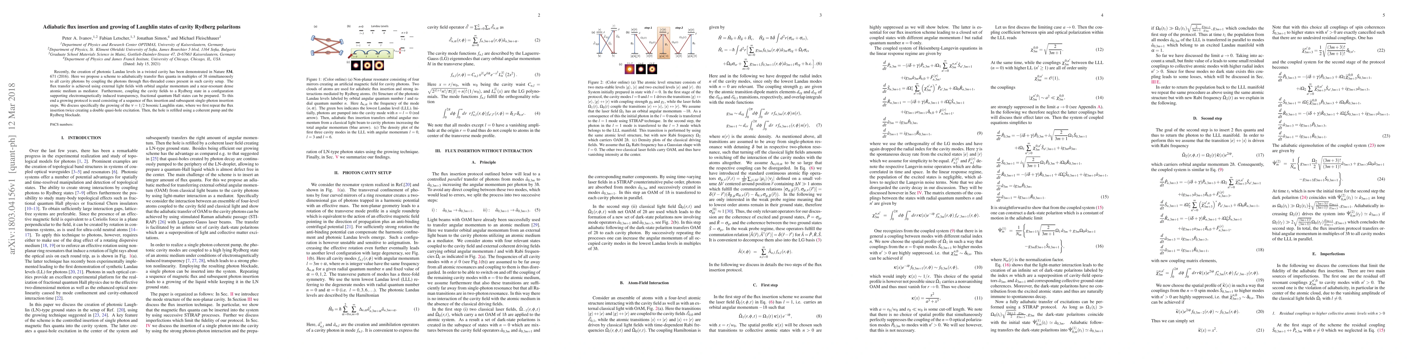 Recently, the creation of photonic Landau levels in a twisted cavity has been demonstrated in Nature \textbf{534}, 671 (2016). Here we propose a scheme to adiabatically transfer flux quanta in multiples of $3\hbar$ simultaneously to all cavity photons by coupling the photons through flux-threaded cones present in such cavity setup. The flux transfer is achieved using external light fields with orbital angular momentum and a near-resonant dense atomic medium as mediator. Furthermore, coupling the cavity fields to a Rydberg state in a configuration supporting electromagnetically induced transparency, fractional quantum Hall states can be prepared. To this end a growing protocol is used consisting of a sequence of flux insertion and subsequent single-photon insertion steps. We discuss specifically the growing of the $\nu=1/2$ bosonic Laughlin state, where we first repeat the flux insertion twice creating a double quasi-hole excitation. Then, the hole is refilled using a coherent pump and the Rydberg blockade.