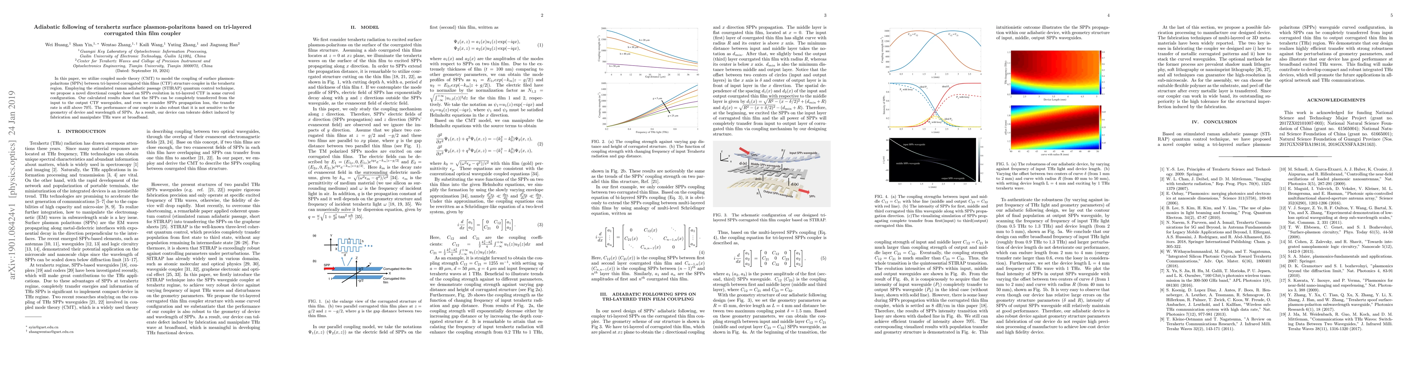This paper models the coupling of terahertz surface plasmon polaritons (SPPs) in a tri-layered corrugated thin film coupler using coupled mode theory and STIRAP quantum control. The proposed coupler achieves high SPP transfer rates above 70% even with propagation loss, demonstrating robustness against geometry and wavelength variations.