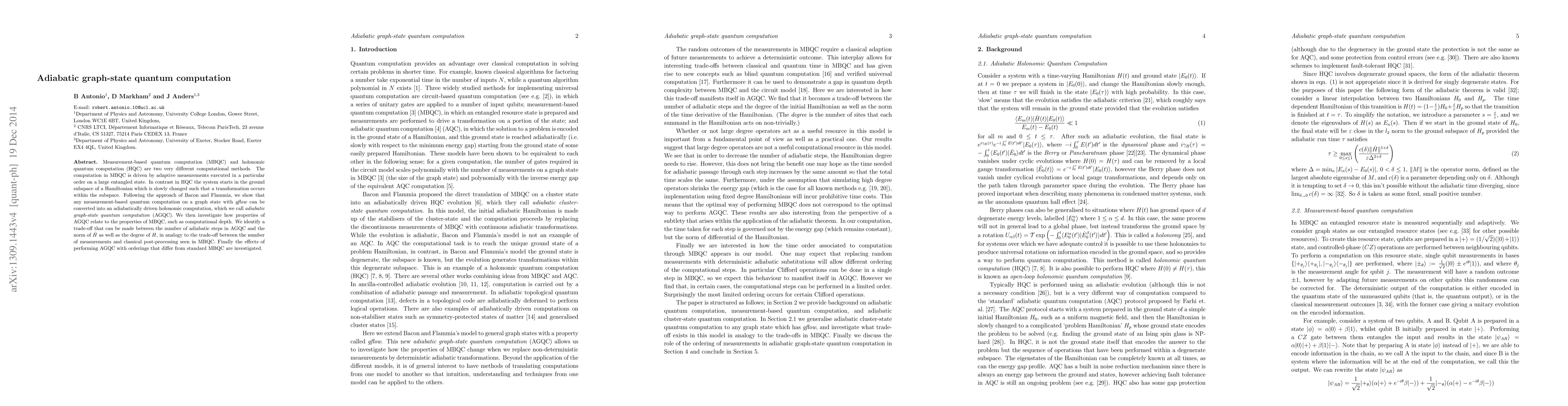 Adiabatic quantum computation using graph states enables universal quantum computing and has potential applications in quantum simulation, quantum metrology, and quantum communication