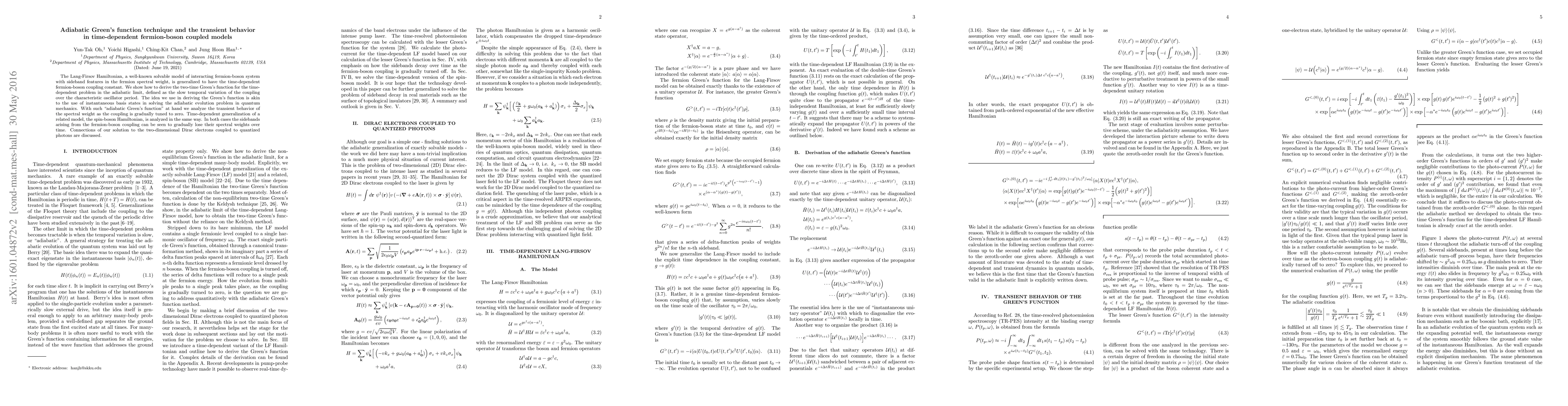 The Lang-Firsov Hamiltonian, a well-known solvable model of interacting fermion-boson system with sideband features in the fermion spectral weight, is generalized to have the time-dependent fermion-boson coupling constant. We show how to derive the two-time Green's function for the time-dependent problem in the adiabatic limit, defined as the slow temporal variation of the coupling over the characteristic oscillator period. The idea we use in deriving the Green's function is akin to the use of instantaneous basis states in solving the adiabatic evolution problem in quantum mechanics. With such "adiabatic Green's function" at hand we analyze the transient behavior of the spectral weight as the coupling is gradually tuned to zero. Time-dependent generalization of a related model, the spin-boson Hamiltonian, is analyzed in the same way. In both cases the sidebands arising from the fermion-boson coupling can be seen to gradually lose their spectral weights over time. Connections of our solution to the two-dimensional Dirac electrons coupled to quantized photons are discussed.