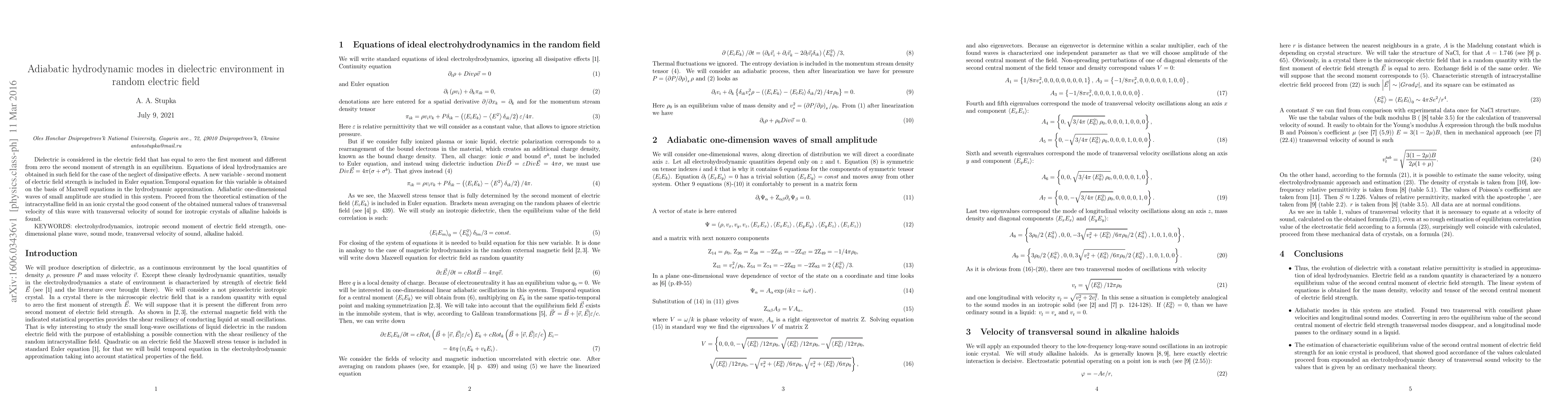 Dielectric is considered in the electric field that has equal to zero the first moment and different from zero the second moment of strength in an equilibrium. The equations of ideal hydrodynamics are obtained in such a field for the case of the neglect of dissipative effects. A new variable - the second moment of electric field strength is included in the Euler equation. A temporal equation for this variable is obtained on the basis of Maxwell equations in the hydrodynamic approximation. Adiabatic one-dimensional waves of small amplitude are studied in this system. Proceeding from the theoretical estimation of the intracrystalline field in an ionic crystal the good consent of the obtained numerical values of transversal velocity of this wave with transversal velocity of sound for isotropic crystals of alkali halides is found.