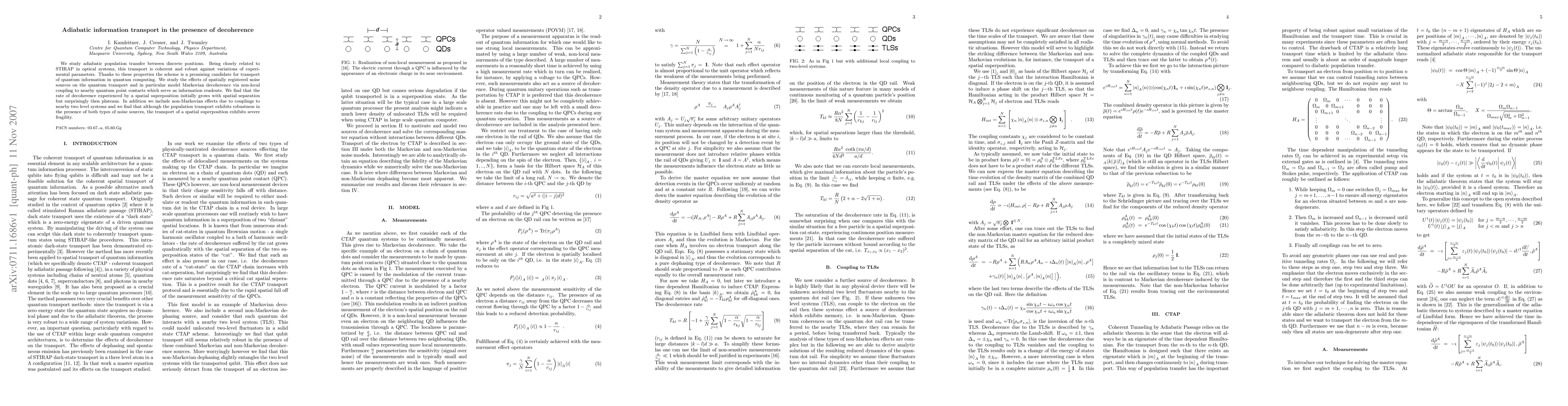 We study adiabatic population transfer between discrete positions. Being closely related to STIRAP in optical systems, this transport is coherent and robust against variations of experimental parameters. Thanks to these properties the scheme is a promising candidate for transport of quantum information in quantum computing. We study the effects of spatially registered noise sources on the quantum transport and in particular model Markovian decoherence via non-local coupling to nearby quantum point contacts which serve as information readouts. We find that the rate of decoherence experienced by a spatial superposition initially grows with spatial separation but surprisingly then plateaus. In addition we include non-Markovian effects due to couplings to nearby two level systems and we find that although the population transport exhibits robustness in the presence of both types of noise sources, the transport of a spatial superposition exhibits severe fragility.