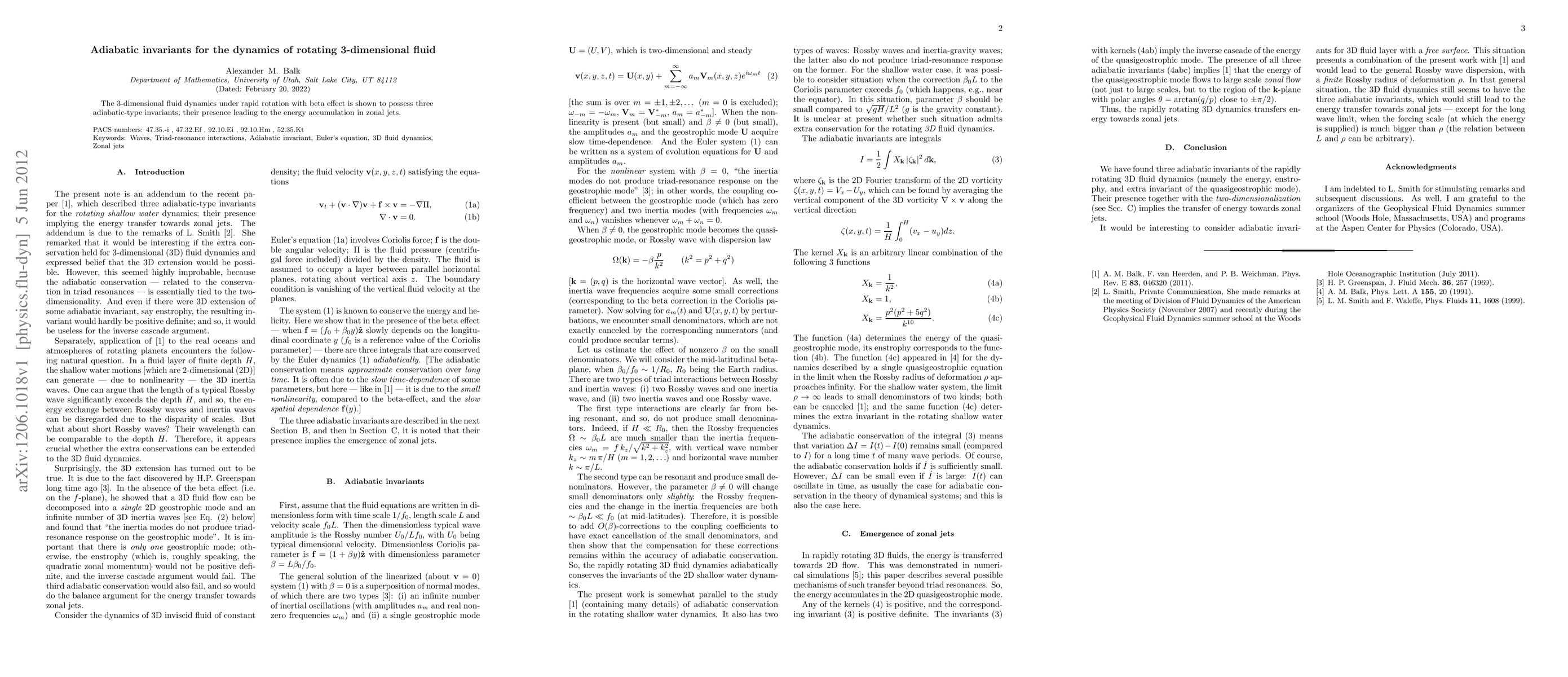 The 3-dimensional fluid dynamics under rapid rotation with beta effect is shown to possess three adiabatic-type invariants; their presence leading to the energy accumulation in zonal jets.