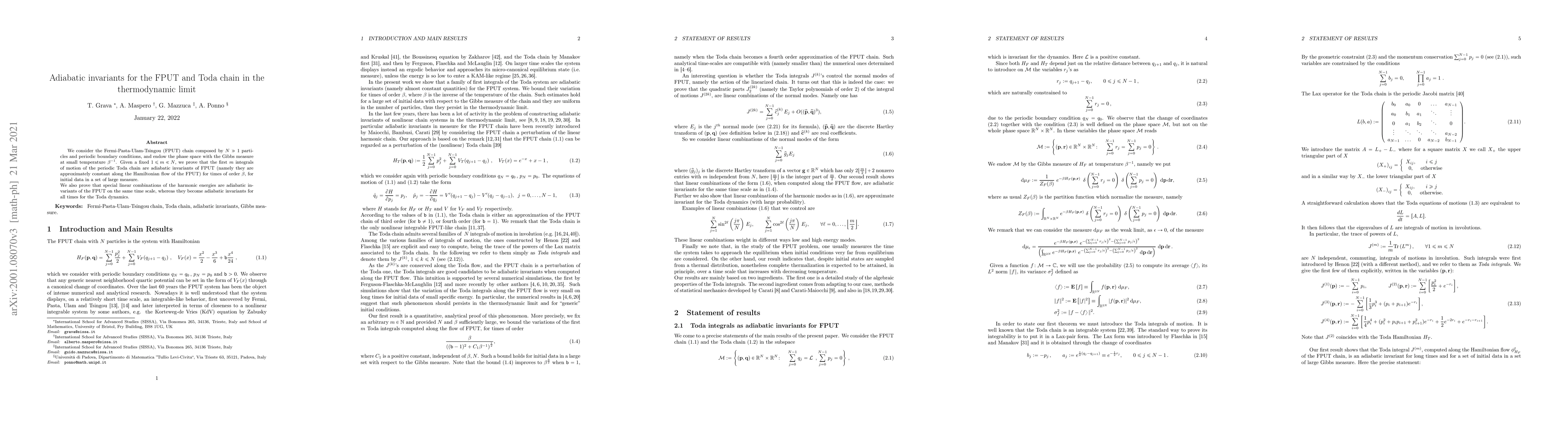 This research establishes that certain integrals of motion from the periodic Toda chain act as adiabatic invariants for the Fermi-Pasta-Ulam-Tsingou (FPUT) chain with many particles under specific conditions. These invariants remain approximately constant along the FPUT's Hamiltonian flow for times scaling with an inverse temperature parameter, beta, for initial data in a substantial phase space subset. The study also reveals that specific linear combinations of harmonic energies exhibit similar adiabatic invariance properties for FPUT, but to a lesser extent, for all times in the Toda chain dynamics.