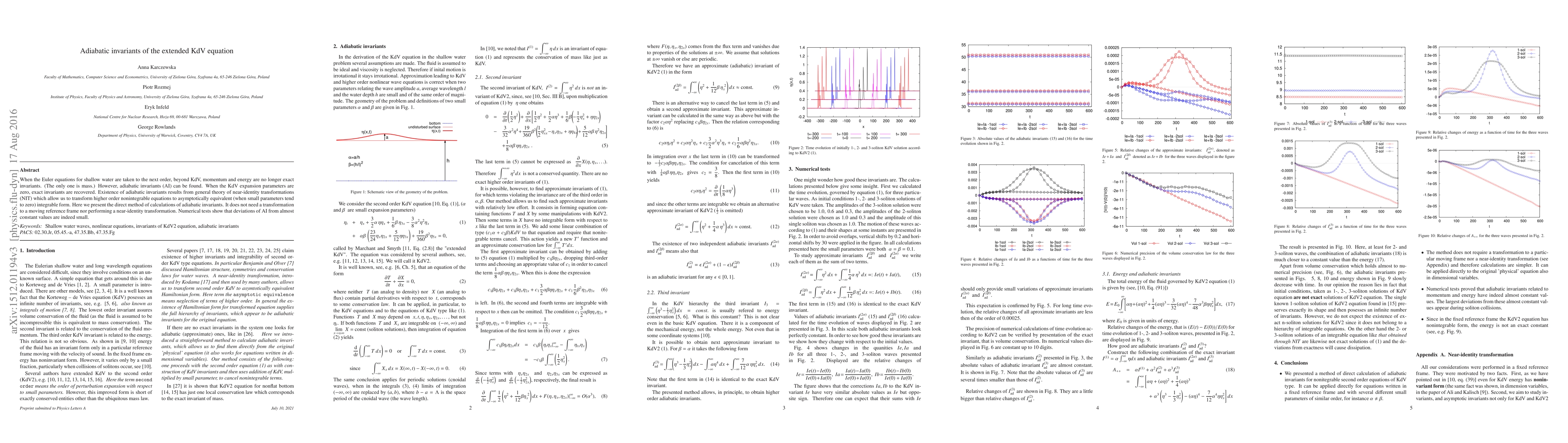 When the Euler equations for shallow water are taken to the next order, beyond KdV, momentum and energy are no longer exact invariants. (The only one is mass.) However, adiabatic invariants (AI) can be found. When the KdV expansion parameters are zero, exact invariants are recovered. Existence of adiabatic invariants results from general theory of near-identity transformations (NIT) which allow us to transform higher order nonintegrable equations to asymptotically equivalent (when small parameters tend to zero) integrable form. Here we present the direct method of calculations of adiabatic invariants. It does not need a transformation to a moving reference frame nor performing a near-identity transformation. Numerical tests show that deviations of AI from almost constant values are indeed small.