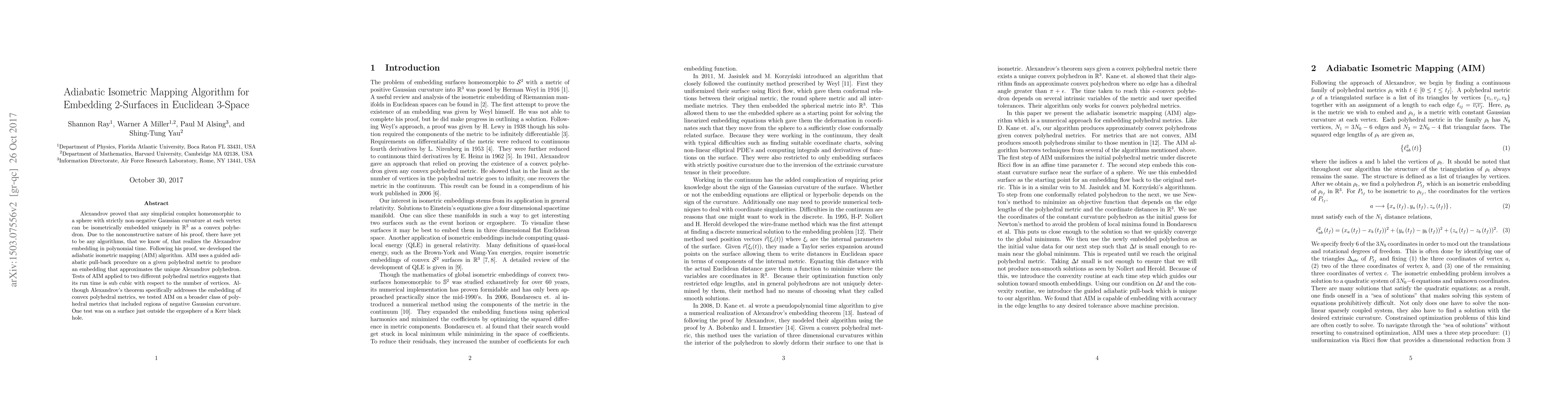Alexandrov proved that any simplicial complex homeomorphic to a sphere with strictly non-negative Gaussian curvature at each vertex can be isometrically embedded uniquely in $\mathbb{R}^3$ as a convex polyhedron. Due to the nonconstructive nature of his proof, there have yet to be any algorithms, that we know of, that realizes the Alexandrov embedding in polynomial time. Following his proof, we developed the adiabatic isometric mapping (AIM) algorithm. AIM uses a guided adiabatic pull-back procedure to produce "smooth" embeddings. Tests of AIM applied to two different polyhedral metrics suggests that its run time is sub cubic with respect to the number of vertices. Although Alexandrov's theorem specifically addresses the embedding of convex polyhedral metrics, we tested AIM on a broader class of polyhedral metrics that included regions of negative Gaussian curvature. One test was on a surface just outside the ergosphere of a Kerr black hole.