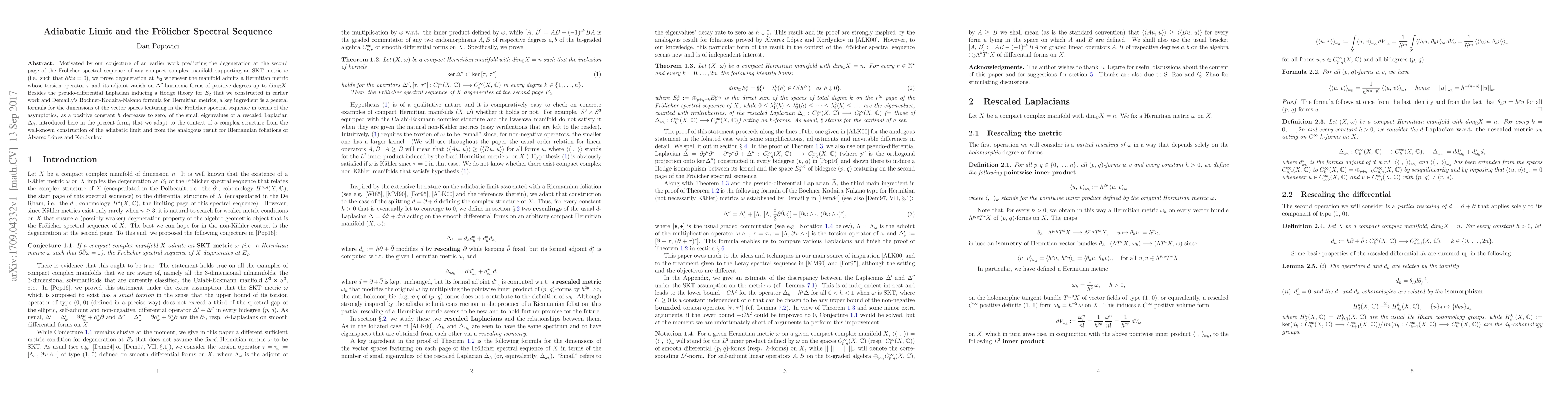 Motivated by our conjecture of an earlier work predicting the degeneration at the second page of the Fr\"olicher spectral sequence of any compact complex manifold supporting an SKT metric $\omega$ (i.e. such that $\partial\bar\partial\omega=0$), we prove degeneration at $E_2$ whenever the manifold admits a Hermitian metric whose torsion operator $\tau$ and its adjoint vanish on $\Delta''$-harmonic forms of positive degrees up to $\mbox{dim}_\C X$. Besides the pseudo-differential Laplacian inducing a Hodge theory for $E_2$ that we constructed in earlier work and Demailly's Bochner-Kodaira-Nakano formula for Hermitian metrics, a key ingredient is a general formula for the dimensions of the vector spaces featuring in the Fr\"olicher spectral sequence in terms of the asymptotics, as a positive constant $h$ decreases to zero, of the small eigenvalues of a rescaled Laplacian $\Delta_h$, introduced here in the present form, that we adapt to the context of a complex structure from the well-known construction of the adiabatic limit and from the analogous result for Riemannian foliations of \'Alvarez L\'opez and Kordyukov.