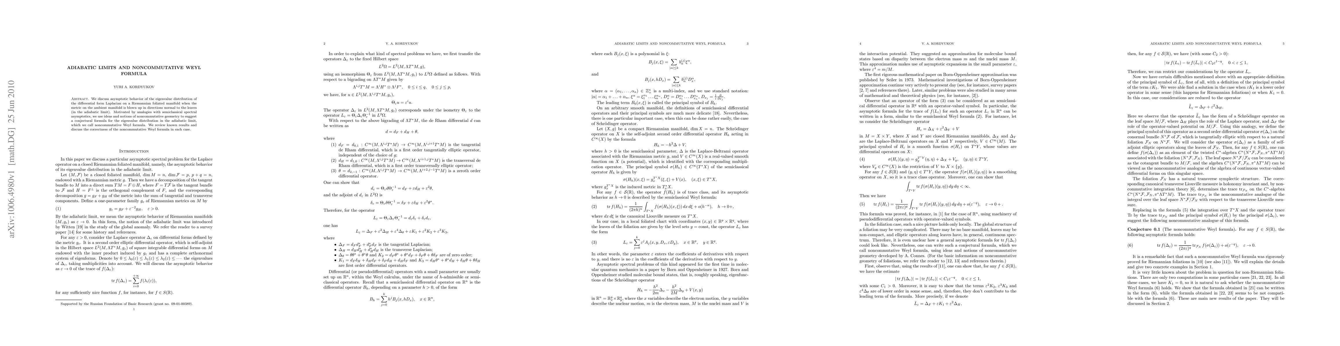 We discuss asymptotic behavior of the eigenvalue distribution of the differential form Laplacian on a Riemannian foliated manifold when the metric on the ambient manifold is blown up in directions normal to the leaves (in the adiabatic limit). Motivated by analogies with semiclassical spectral asymptotics, we use ideas and notions of noncommutative geometry to suggest a conjectural formula for the eigenvalue distribution in the adiabatic limit, which we call noncommutative Weyl formula. We review known results and discuss the correctness of the noncommutative Weyl formula in each case.