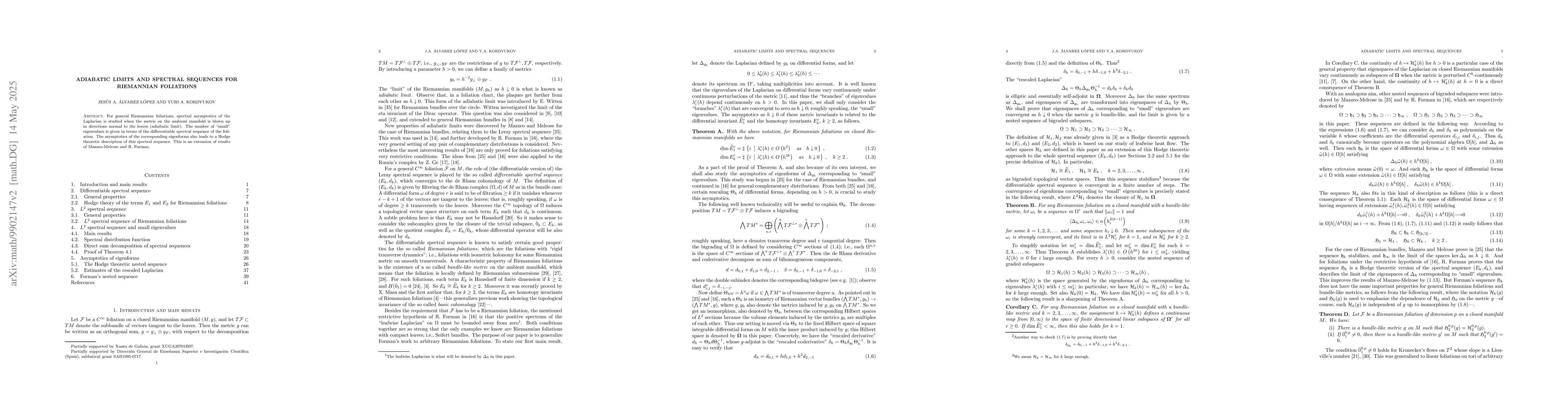 For general Riemannian foliations, spectral asymptotics of the Laplacian is studied when the metric on the ambient manifold is blown up in directions normal to the leaves (adiabatic limit). The number of ``small'' eigenvalues is given in terms of the differentiable spectral sequence of the foliation. The asymptotics of the corresponding eigenforms also leads to a Hodge theoretic description of this spectral sequence. This is an extension of results of Mazzeo-Melrose and R. Forman.