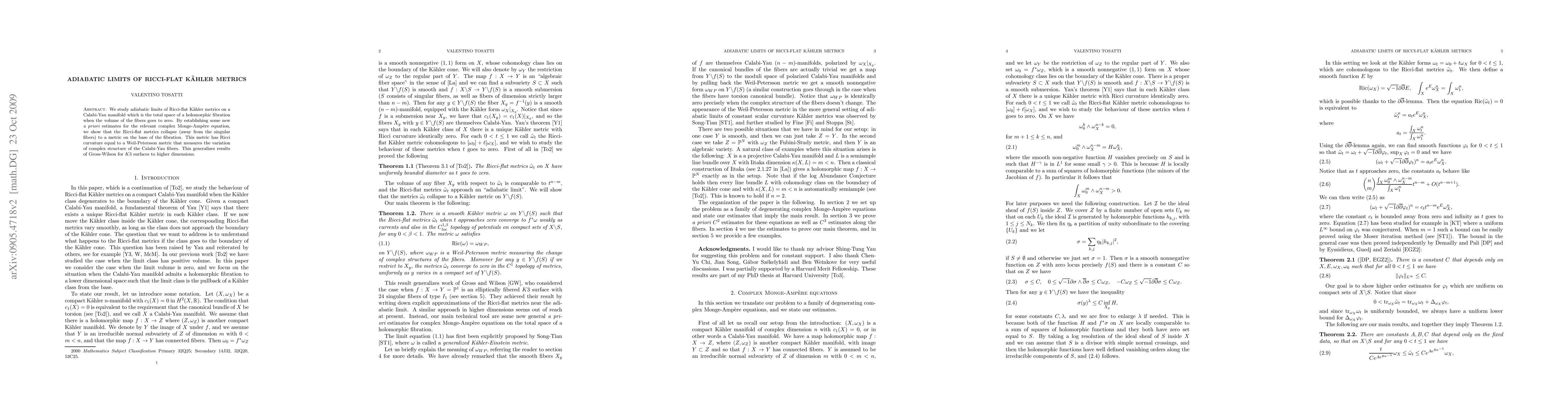 The paper explores the adiabatic limits of Ricci-flat Kähler metrics on Calabi-Yau manifolds as the volume of fibers diminishes, demonstrating that these metrics collapse to a Ricci-flat metric on the base with Ricci curvature equal to a Weil-Petersson metric, generalizing results for K3 surfaces to higher dimensions. New a priori estimates for the complex Monge-Ampere equation were established to support these findings.