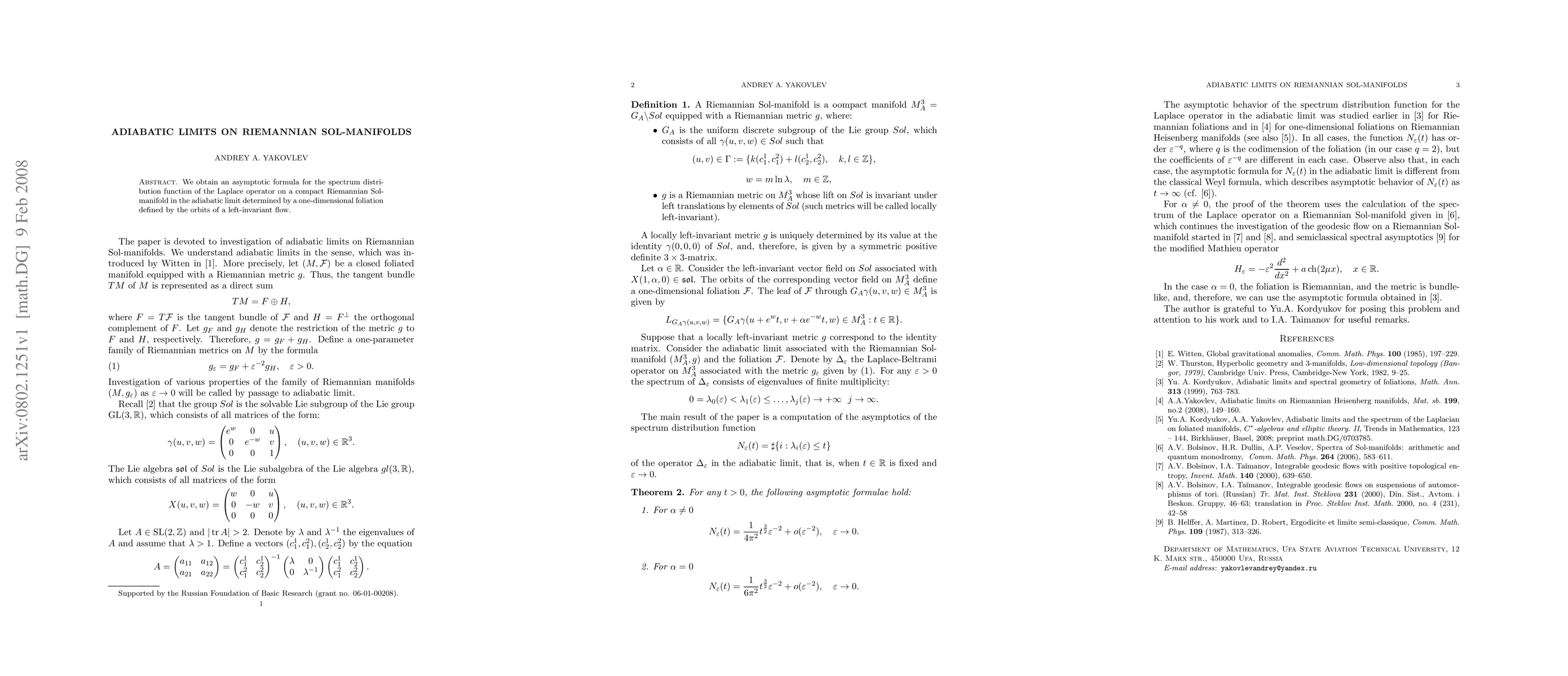 We obtain an asymptotic formula for the spectrum distribution function of the Laplace operator on a compact Riemannian Sol-manifold in the adiabatic limit determined by a one-dimensional foliation defined by the orbits of a left-invariant flow.