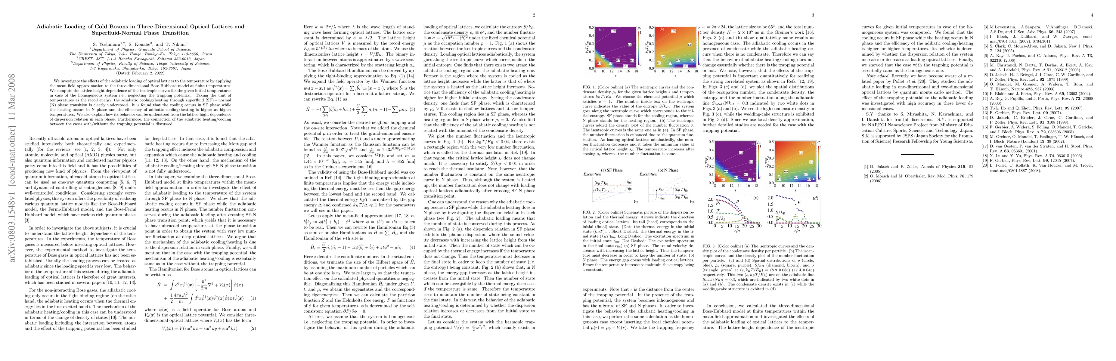 This paper studies adiabatic loading of cold bosons in three-dimensional optical lattices using the Bose-Hubbard model, revealing that adiabatic cooling occurs in the superfluid phase while heating occurs in the normal phase, with higher efficiency at higher temperatures. The findings are explained through the lattice-height dependence of the dispersion relation and the impact of trapping potentials.