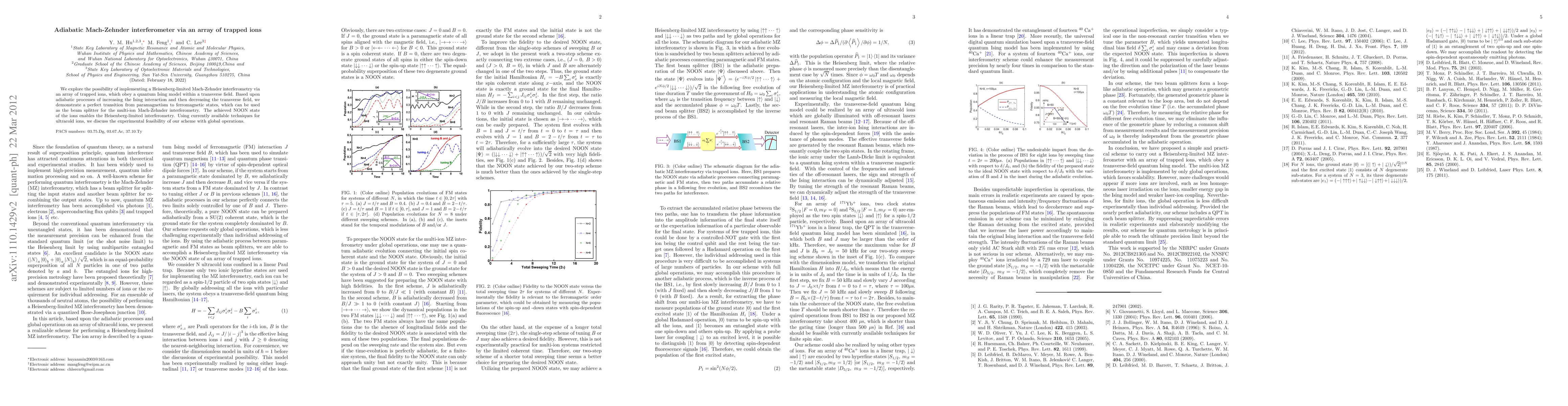 We explore the possibility of implementing a Heisenberg-limited Mach-Zehnder interferometry via an array of trapped ions, which obey a quantum Ising model within a transverse field. Based upon adiabatic processes of increasing the Ising interaction and then decreasing the transverse field, we demonstrate a perfect transition from paramagnetism to ferromagnetic states, which can be used as the beam splitter for the multi-ion Mach-Zehnder interferometry. The achieved NOON state of the ions enables the Heisenberg-limited interferometry. Using currently available techniques for ultracold ions, we discuss the experimental feasibility of our scheme with global operations.