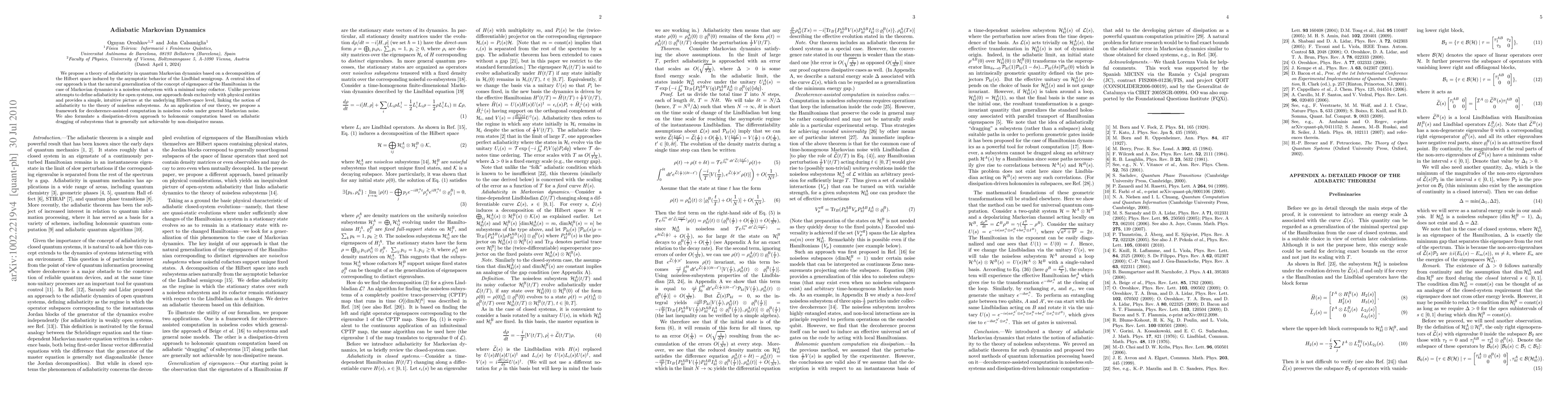 We propose a theory of adiabaticity in quantum Markovian dynamics based on a decomposition of the Hilbert space induced by the asymptotic behavior of the Lindblad semigroup. A central idea of our approach is that the natural generalization of the concept of eigenspace of the Hamiltonian in the case of Markovian dynamics is a noiseless subsystem with a minimal noisy cofactor. Unlike previous attempts to define adiabaticity for open systems, our approach deals exclusively with physical entities and provides a simple, intuitive picture at the underlying Hilbert-space level, linking the notion of adiabaticity to the theory of noiseless subsystems. As an application of our theory, we propose a framework for decoherence-assisted computation in noiseless codes under general Markovian noise. We also formulate a dissipation-driven approach to holonomic computation based on adiabatic dragging of subsystems that is generally not achievable by non-dissipative means.