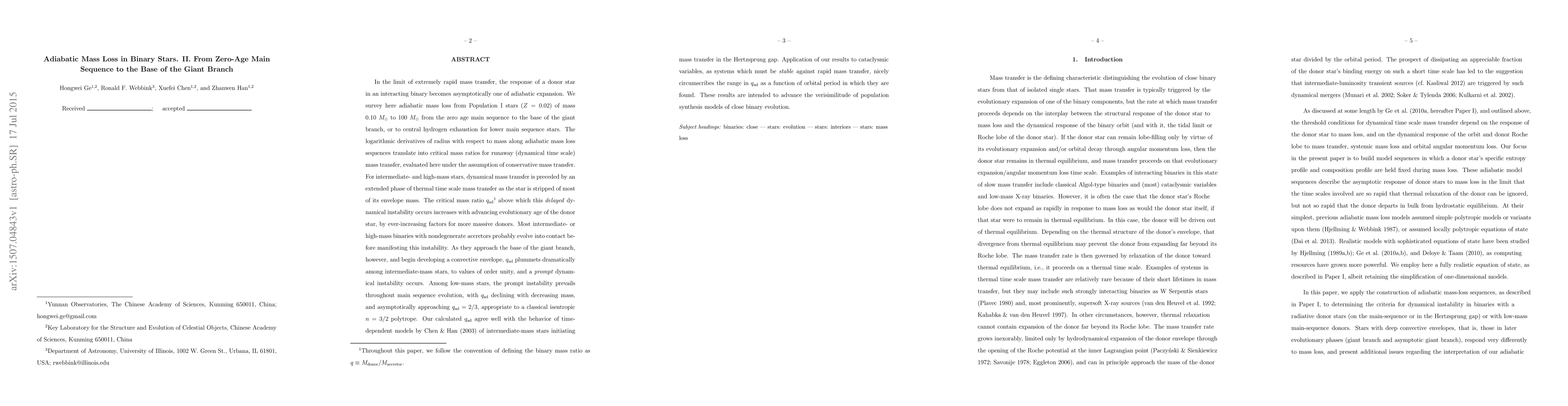 This paper examines adiabatic mass loss in binary stars from the zero-age main sequence to the base of the giant branch, finding that intermediate- and high-mass stars undergo extended thermal mass transfer before a delayed dynamical instability. The critical mass ratio for this instability decreases significantly among intermediate-mass stars as they near the giant branch, leading to rapid dynamical instability.