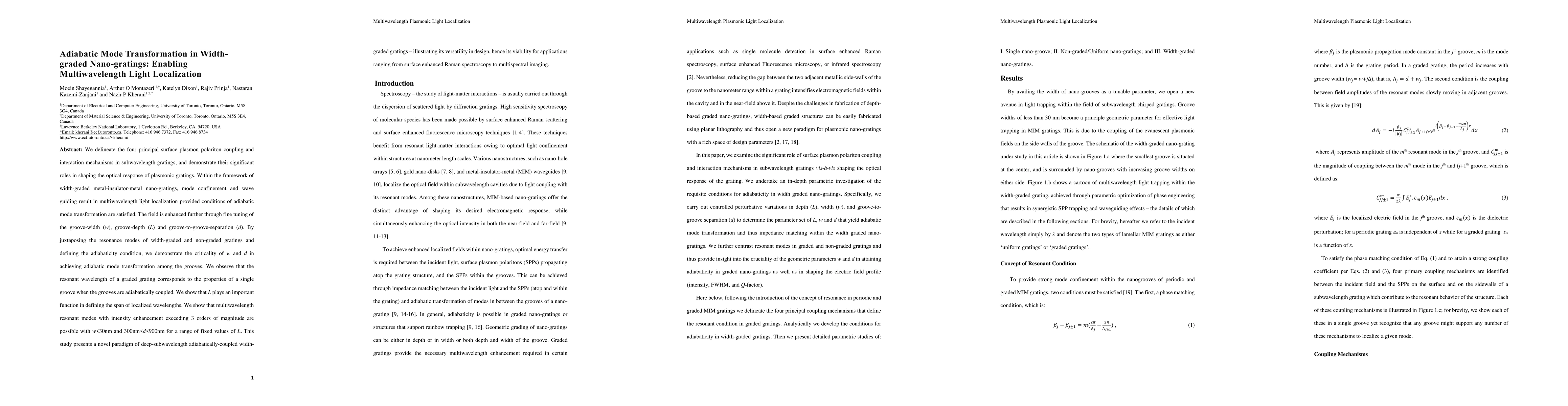 This paper explores the optical response of width-graded nano-gratings, demonstrating how adiabatic mode transformation enables multiwavelength light localization. It highlights the importance of groove-width and separation for achieving effective mode coupling and wavelength localization, showing potential applications in enhanced Raman spectroscopy and multispectral imaging.
