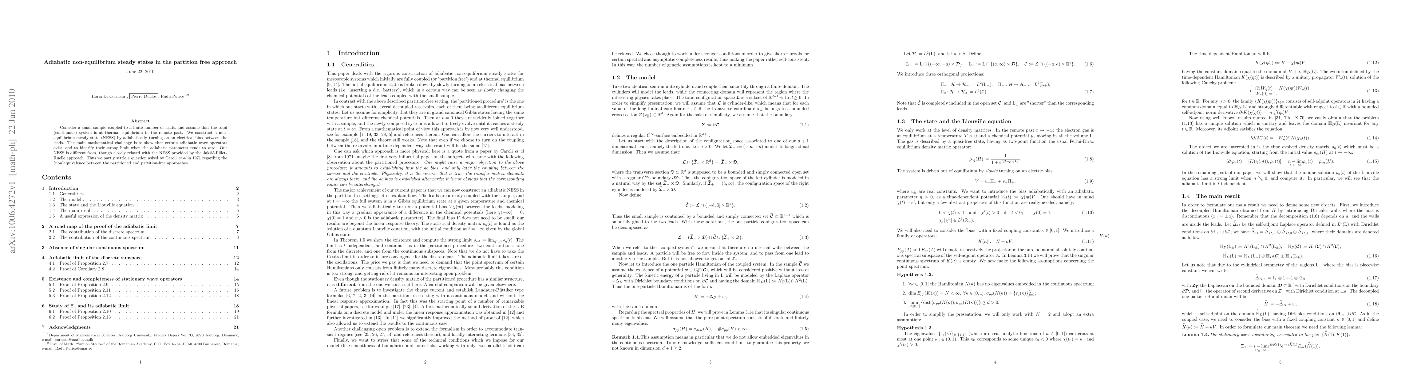 Consider a small sample coupled to a finite number of leads, and assume that the total (continuous) system is at thermal equilibrium in the remote past. We construct a non-equilibrium steady state (NESS) by adiabatically turning on an electrical bias between the leads. The main mathematical challenge is to show that certain adiabatic wave operators exist, and to identify their strong limit when the adiabatic parameter tends to zero. Our NESS is different from, though closely related with the NESS provided by the Jak{\v s}i{\'c}-Pillet-Ruelle approach. Thus we partly settle a question asked by Caroli {\it et al} in 1971 regarding the (non)equivalence between the partitioned and partition-free approaches.