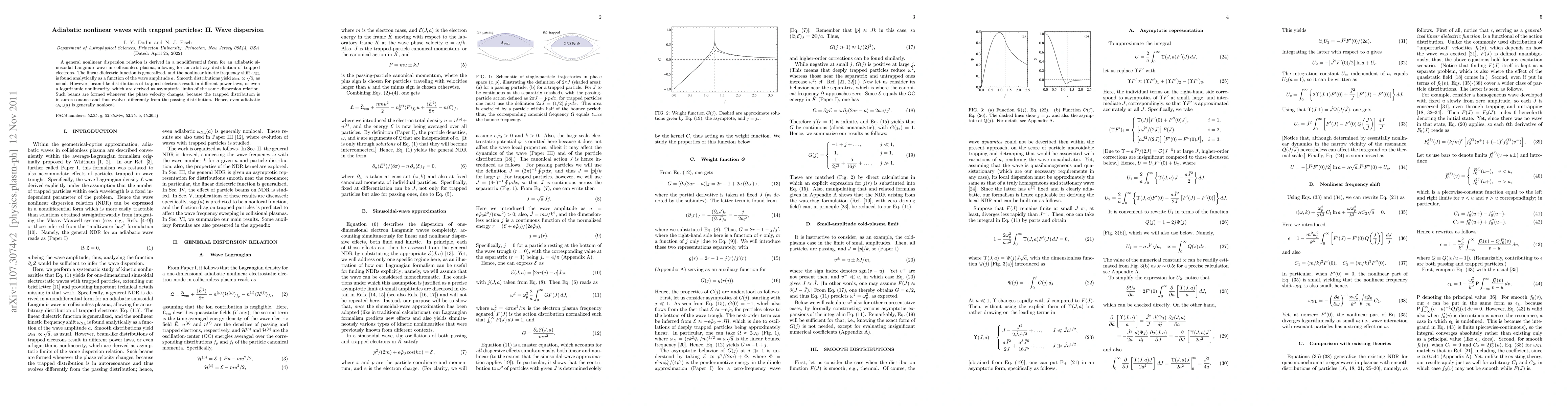 A general nonlinear dispersion relation is derived in a nondifferential form for an adiabatic sinusoidal Langmuir wave in collisionless plasma, allowing for an arbitrary distribution of trapped electrons. The linear dielectric function is generalized, and the nonlinear kinetic frequency shift $\omega_{\rm NL}$ is found analytically as a function of the wave amplitude $a$. Smooth distributions yield $\omega_{\rm NL} \propto \sqrt{a}$, as usual. However, beam-like distributions of trapped electrons result in different power laws, or even a logarithmic nonlinearity, which are derived as asymptotic limits of the same dispersion relation. Such beams are formed whenever the phase velocity changes, because the trapped distribution is in autoresonance and thus evolves differently from the passing distribution. Hence, even adiabatic $\omega_{\rm NL}(a)$ is generally nonlocal.