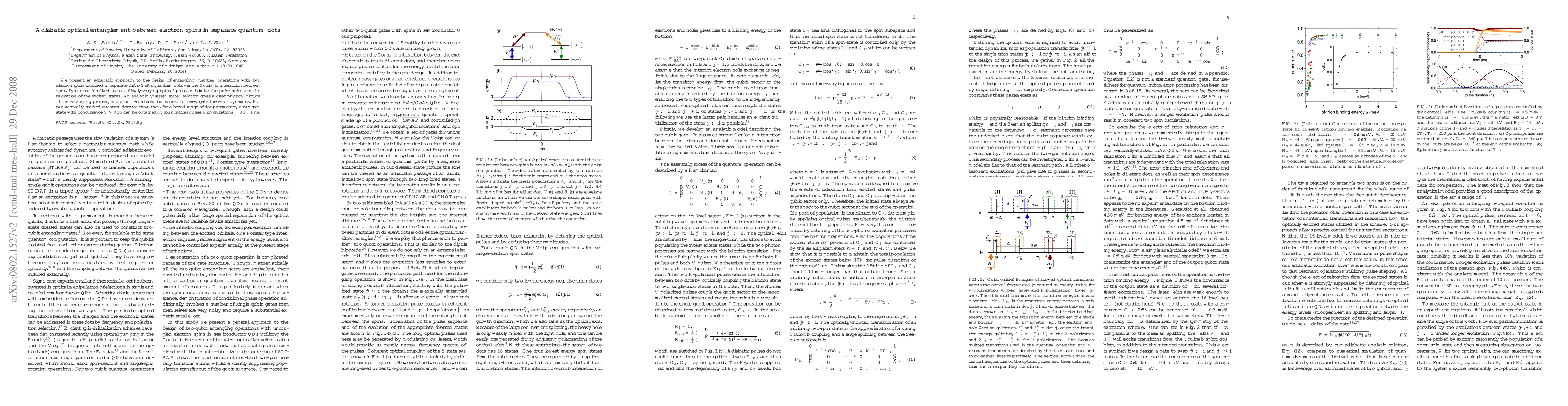 This paper proposes an adiabatic method for entangling electron spins in separate quantum dots using optical pulses, achieving high concurrence ($C>0.85$) through slow variations that minimize noise and relaxation. The approach utilizes the Coulomb interaction between optically-excited states and demonstrates effective error dynamics.
