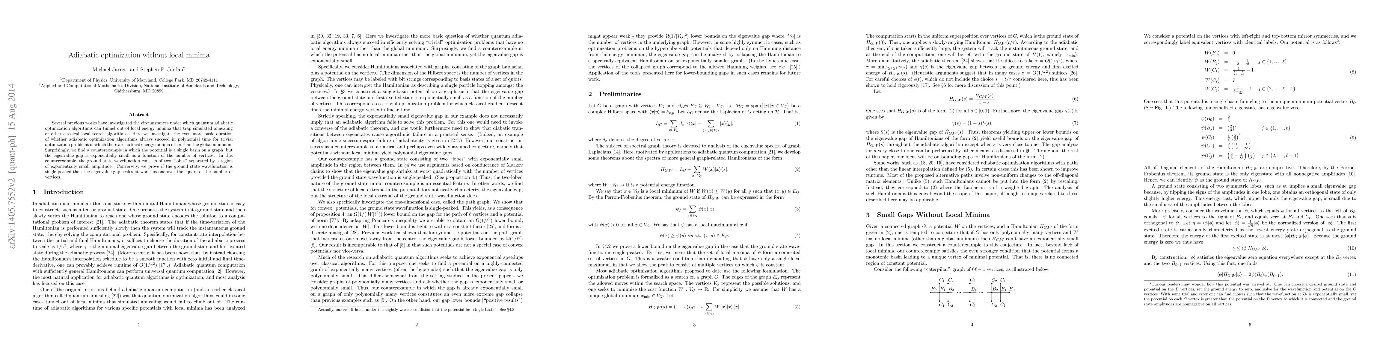 This paper explores the success of adiabatic optimization algorithms in polynomial time for trivial optimization problems without local minima. It reveals a counterexample where the algorithm fails due to an exponentially small eigenvalue gap, contrasting with the proof that single-peaked ground state wavefunctions ensure a polynomial-time success bound.